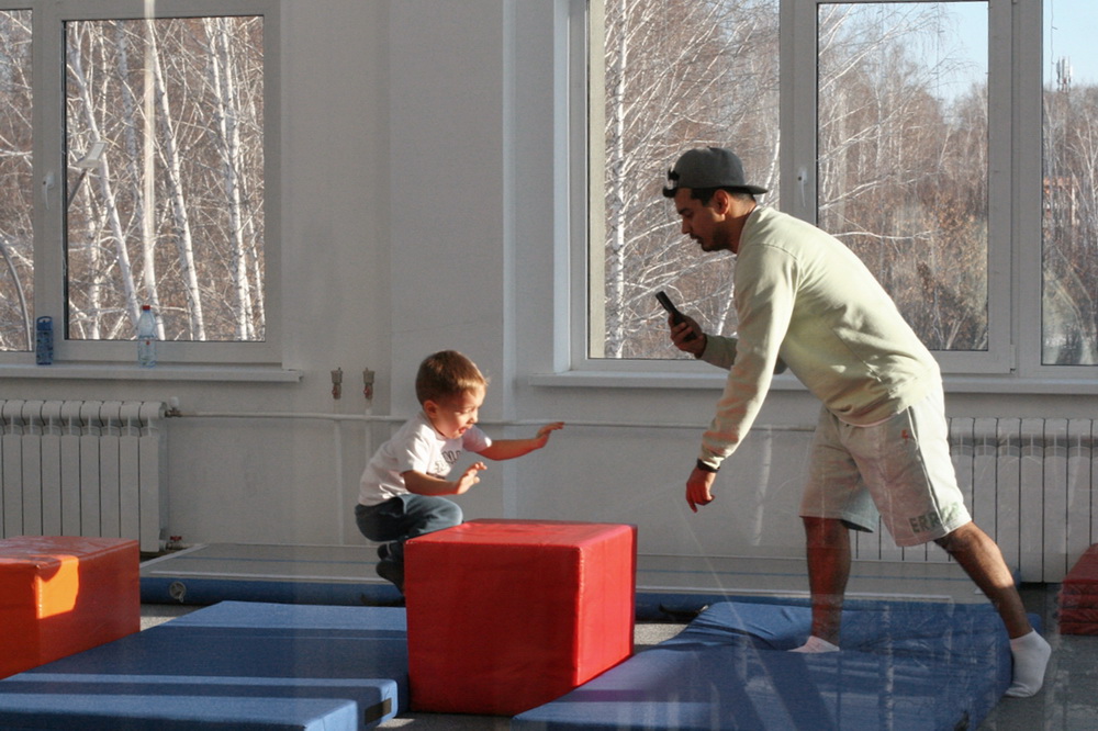 На четвёртом уровне школы оборудовали спортзал для паркура и акробатики. Дети учатся прыгать, делать сальто и даже проходят нормативы. Здесь есть всё необходимое оборудование.