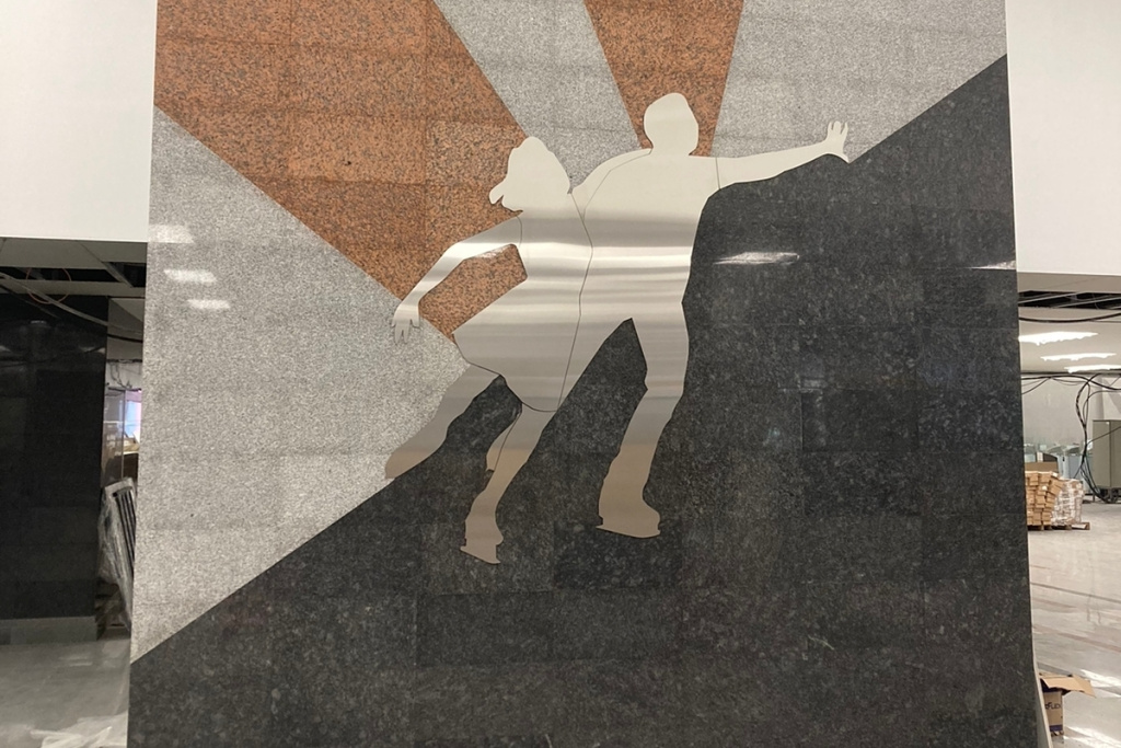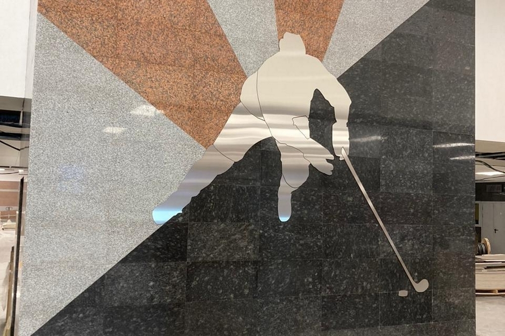 Он добавил, что интерьер «Спортивной» дополнили двумя большими панно из нержавеющей стали. На них изображены фигуристы и хоккеист. Композиции повесили на стенах лифтовых шахт в вестибюле.
