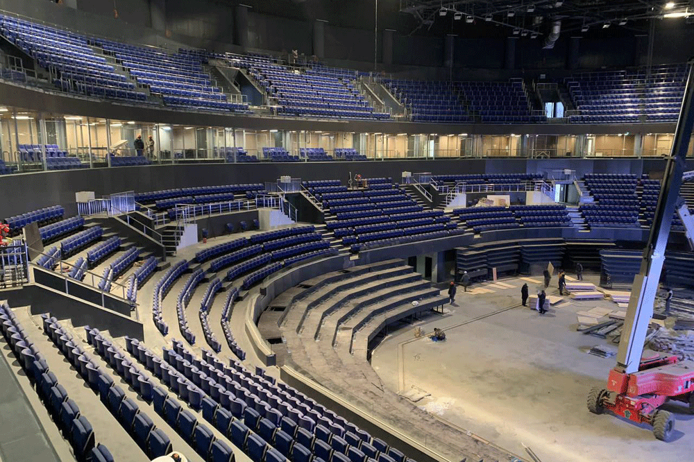 Завозят мебель и оборудование, завершают монтаж потолков, устраняют дефекты, возникшие в ходе отделки. На малой арене устанавливают хоккейные борта-трансформеры.