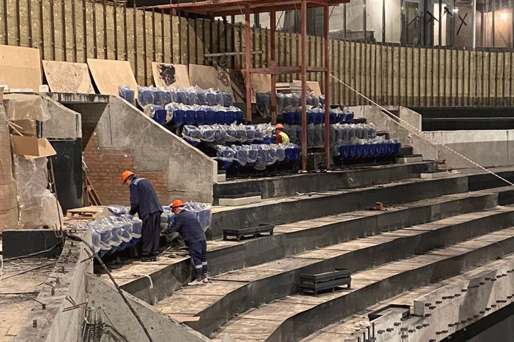Строители практически завершили обустройство наружных инженерных сетей и ливневой канализации, красят стены, наносят декоративную штукатурку, кладут плитку на пол и лестничные марши. Снаружи дворца спорта укладывают брусчатку и асфальт.