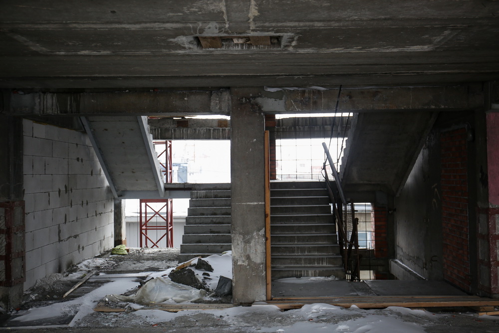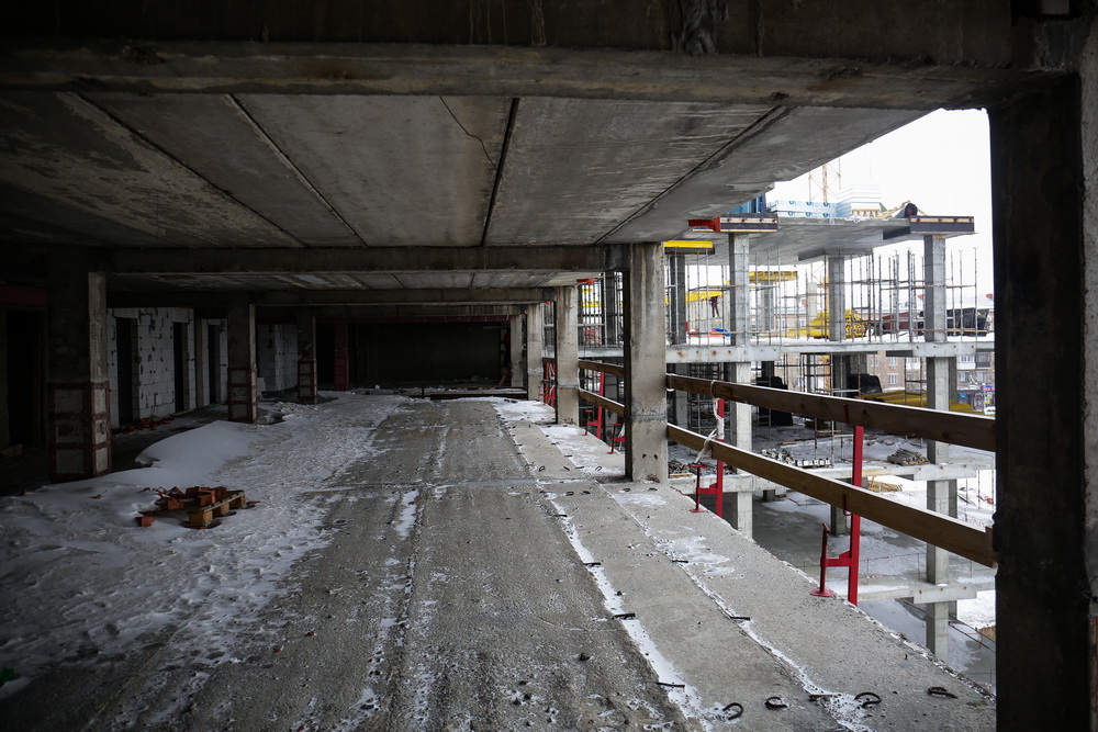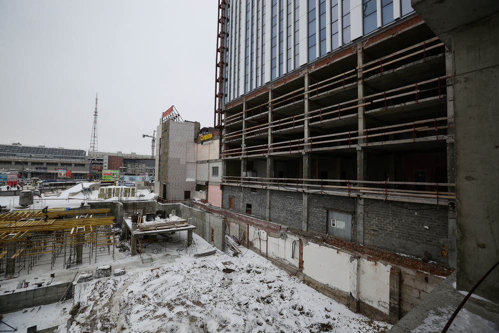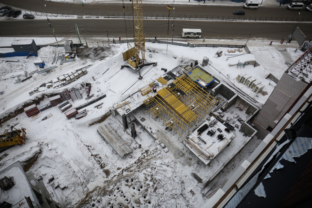 В помещениях, где смонтирован временный тепловой контур и установлены тепловые пушки, рабочие ведут отделку, прокладку инженерных сетей, систем электроснабжения, пожаротушения, вентиляции. На этажах, где контур ещё не закрыли, гуляет ледяной ветер. Там отделочные работы начнут с приходом весны — при стабильных положительных температурах.