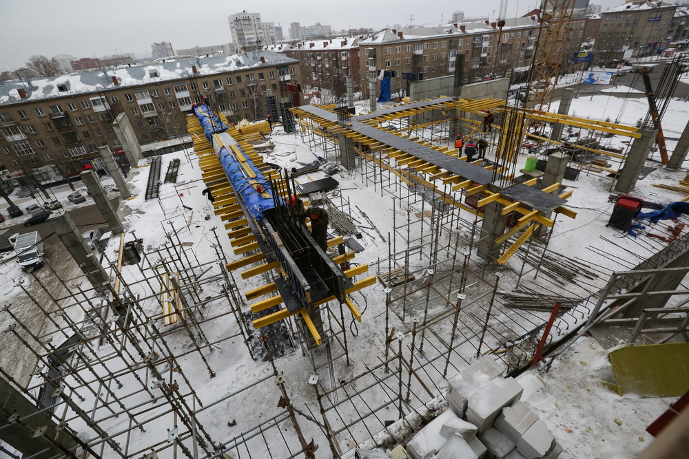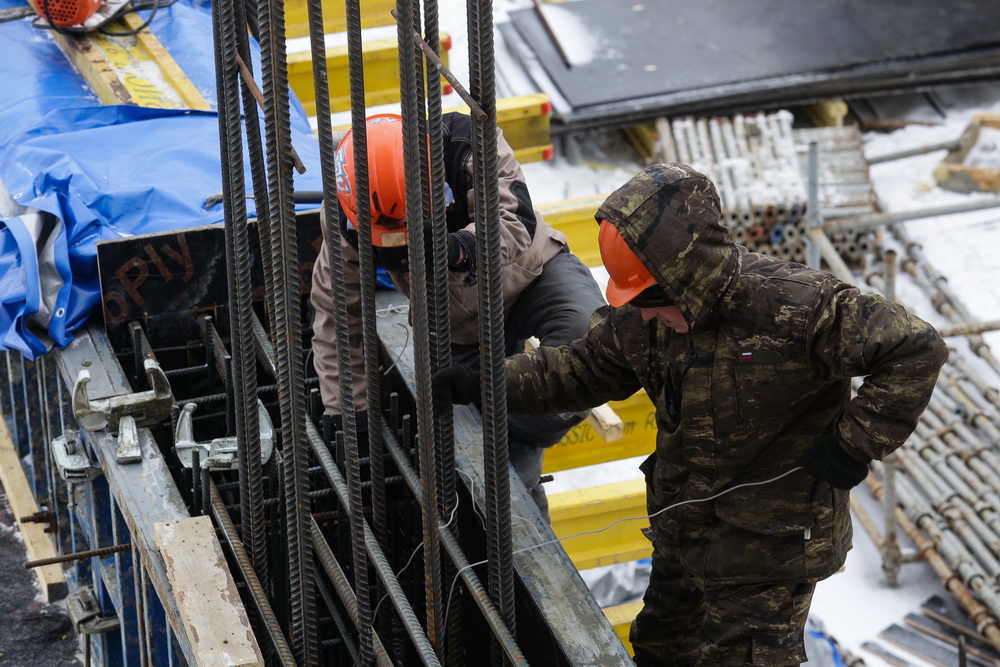 Сегодня на стройплощадке заняты 100 человек. Бетонщики работают посменно без выходных, чтобы процессы не останавливались. «За лето мы должны сделать максимально большой объём бетонных работ, а также завершить монтаж фасада», — говорит Алексей Машков.