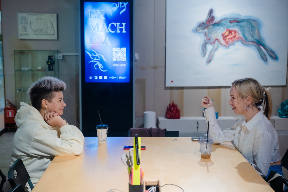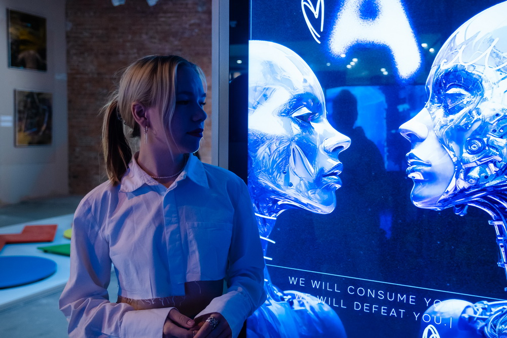 Выставка называется Ex Machina — она создана по мотивам одноимённого фильма про женщину-робота, которая хотела стать человеком. Мы предложили художникам пофантазировать на тему переосмысления роли нейросетей в нашей жизни. Вся идея в том, что люди начали повсеместно окружать себя новыми технологиями.