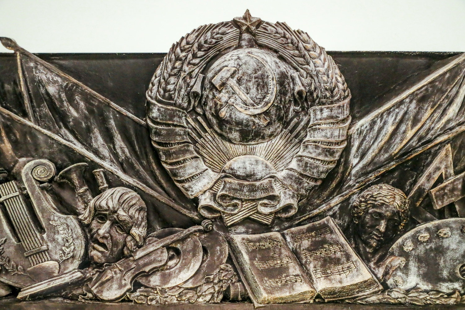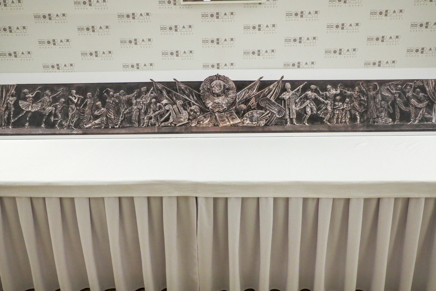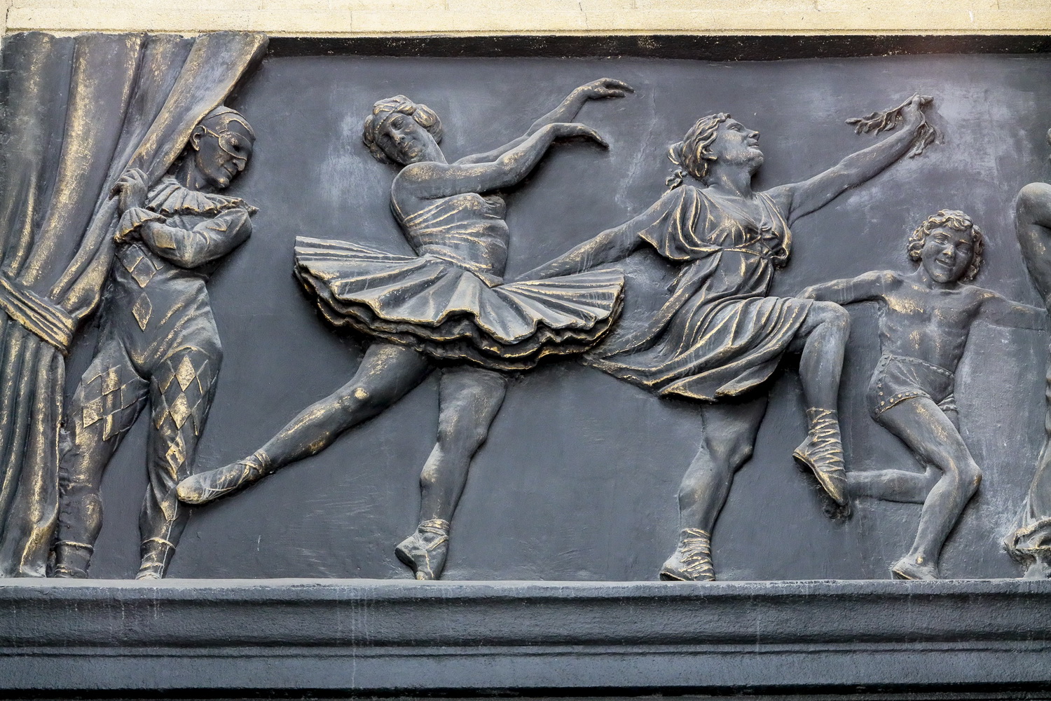 Вместе с тем публика видит две детали — герб СССР над центральным входом и балерину в левой части барельефа.