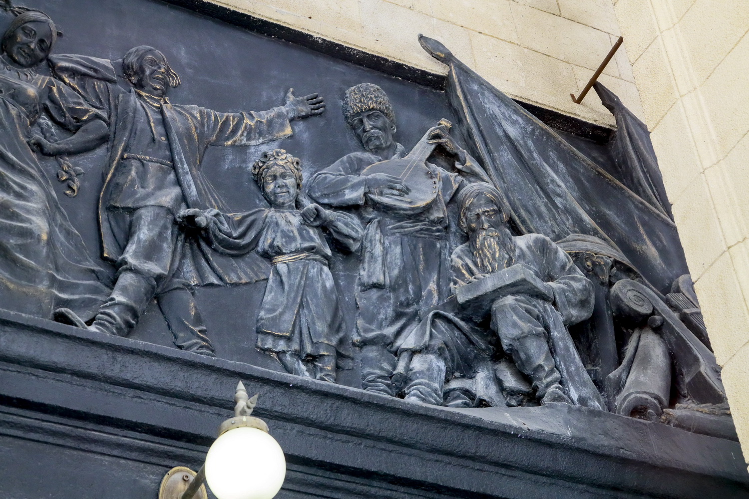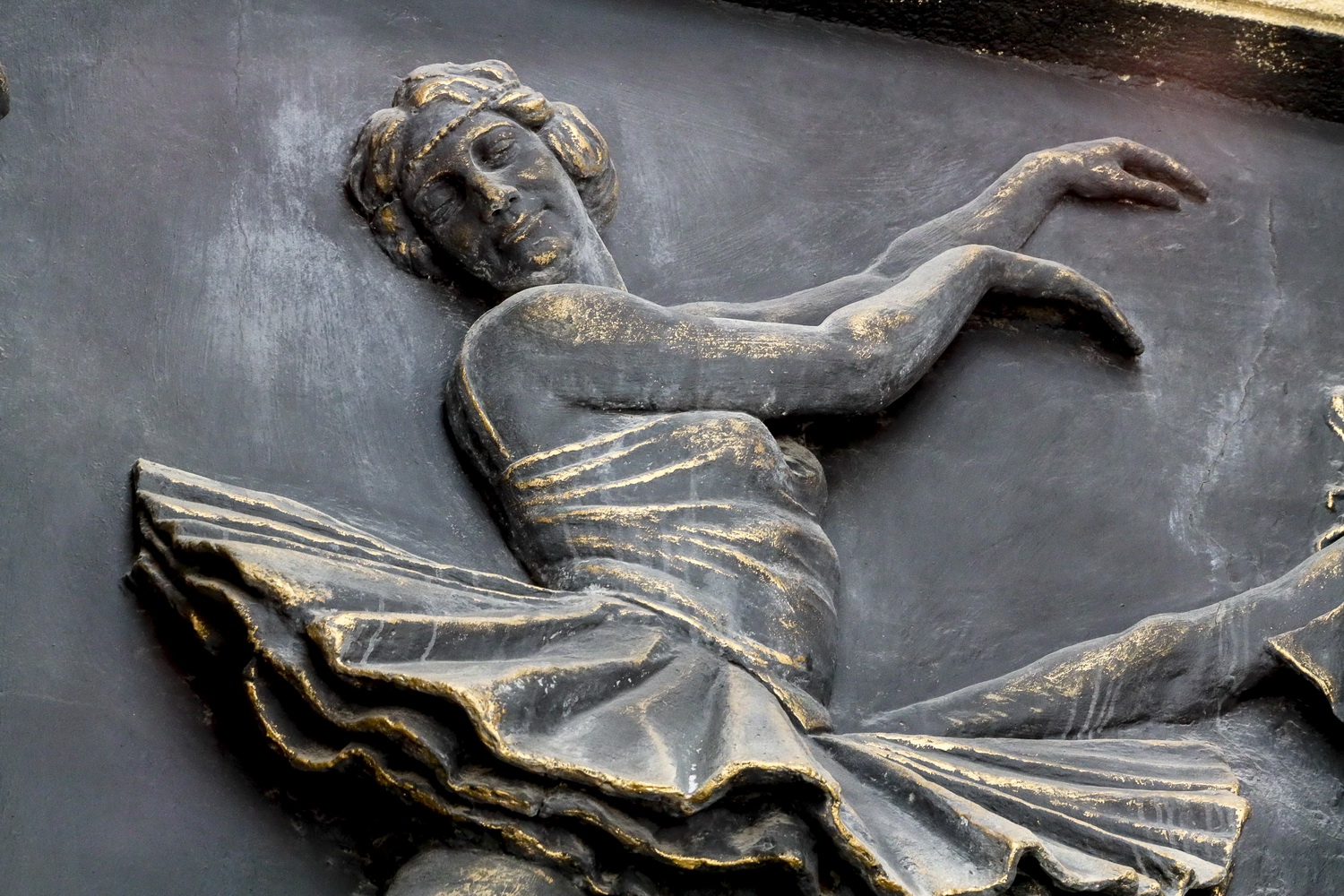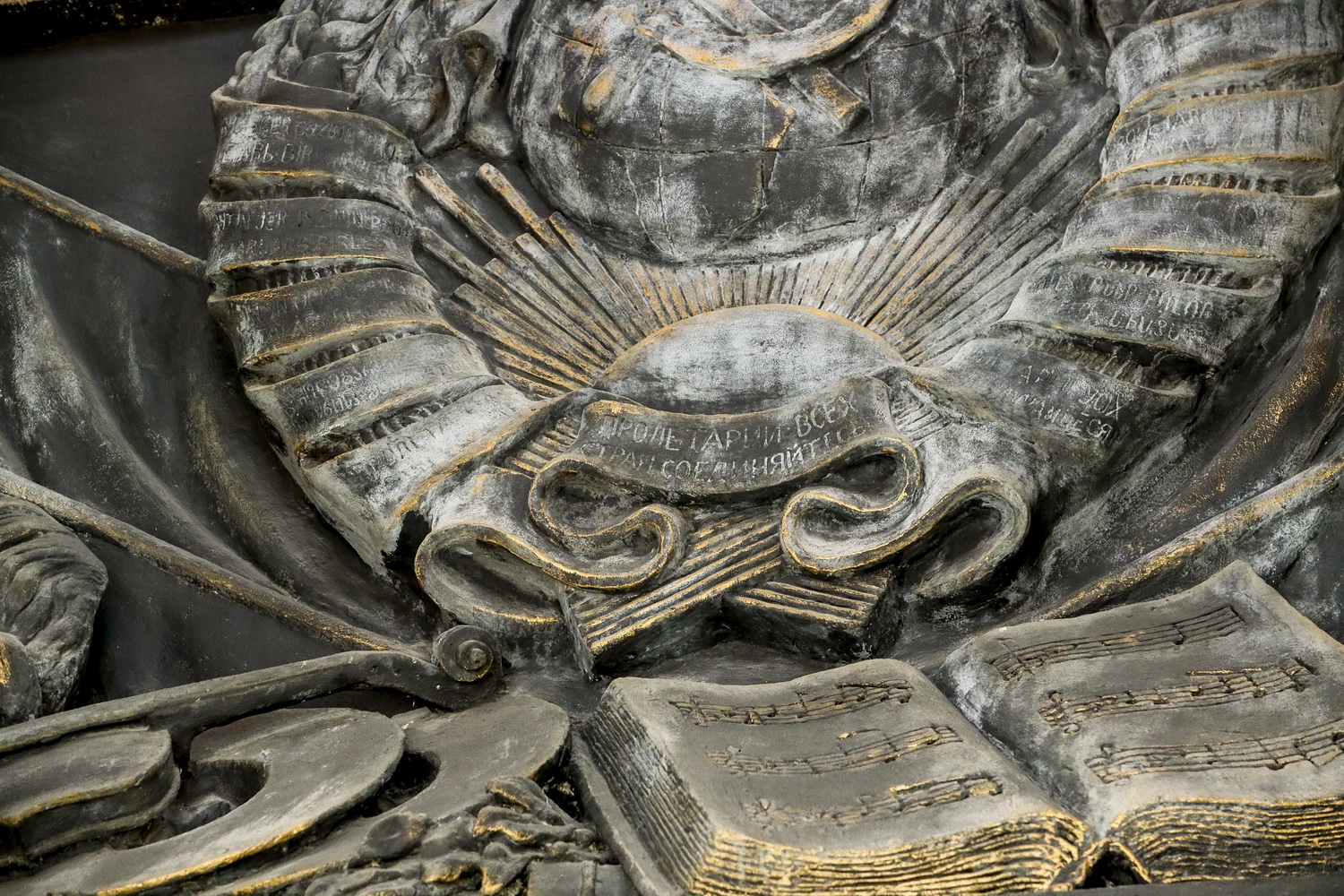 Вместе с тем публика видит две детали — герб СССР над центральным входом и балерину в левой части барельефа.