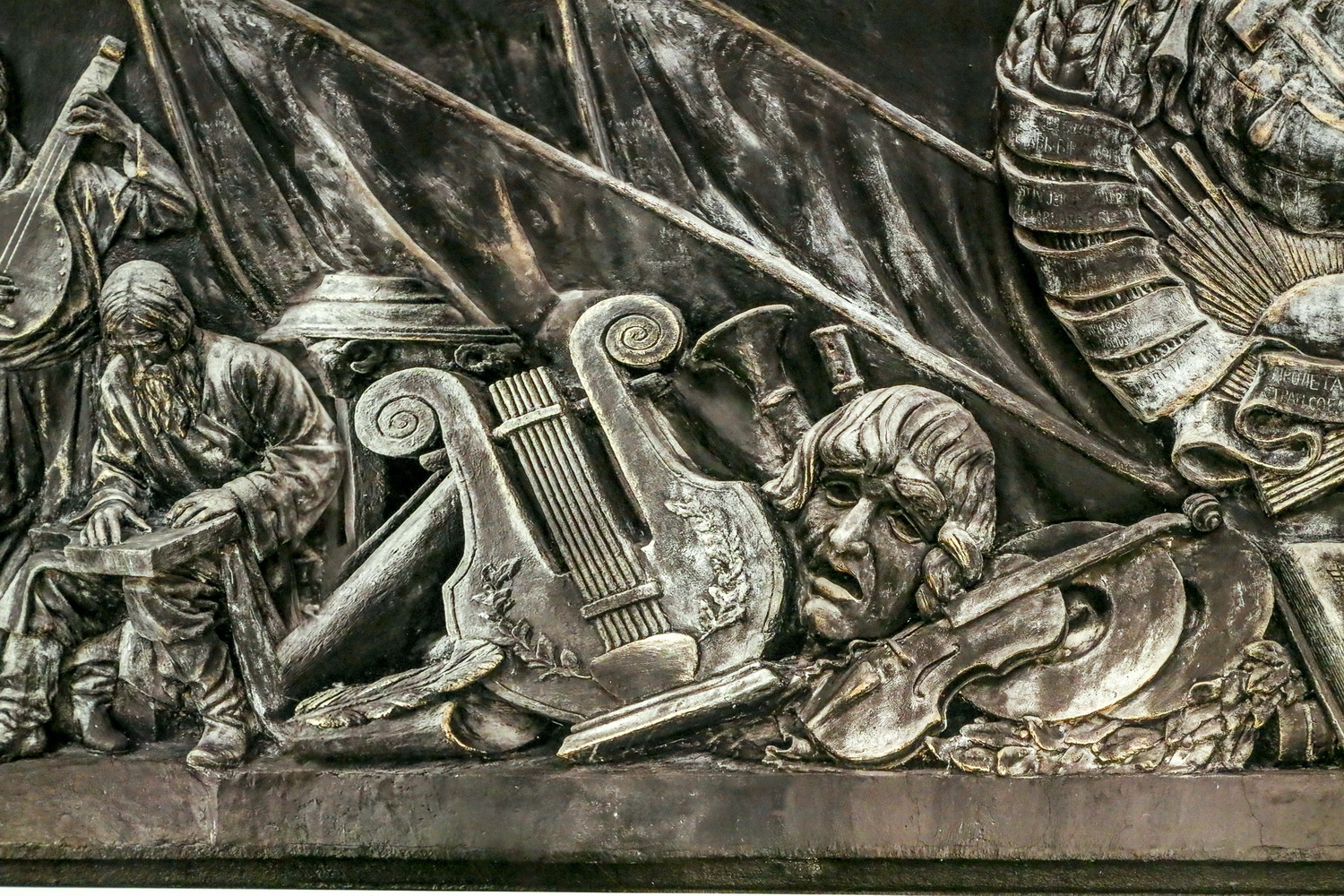 Недавно я с помощью ИИ попытался сделать реконструкцию, как выглядел бы барельеф при отсутствии афиш на колоннах, и оказалось, что максимально увидеть можно чуть больше половины всего произведения.