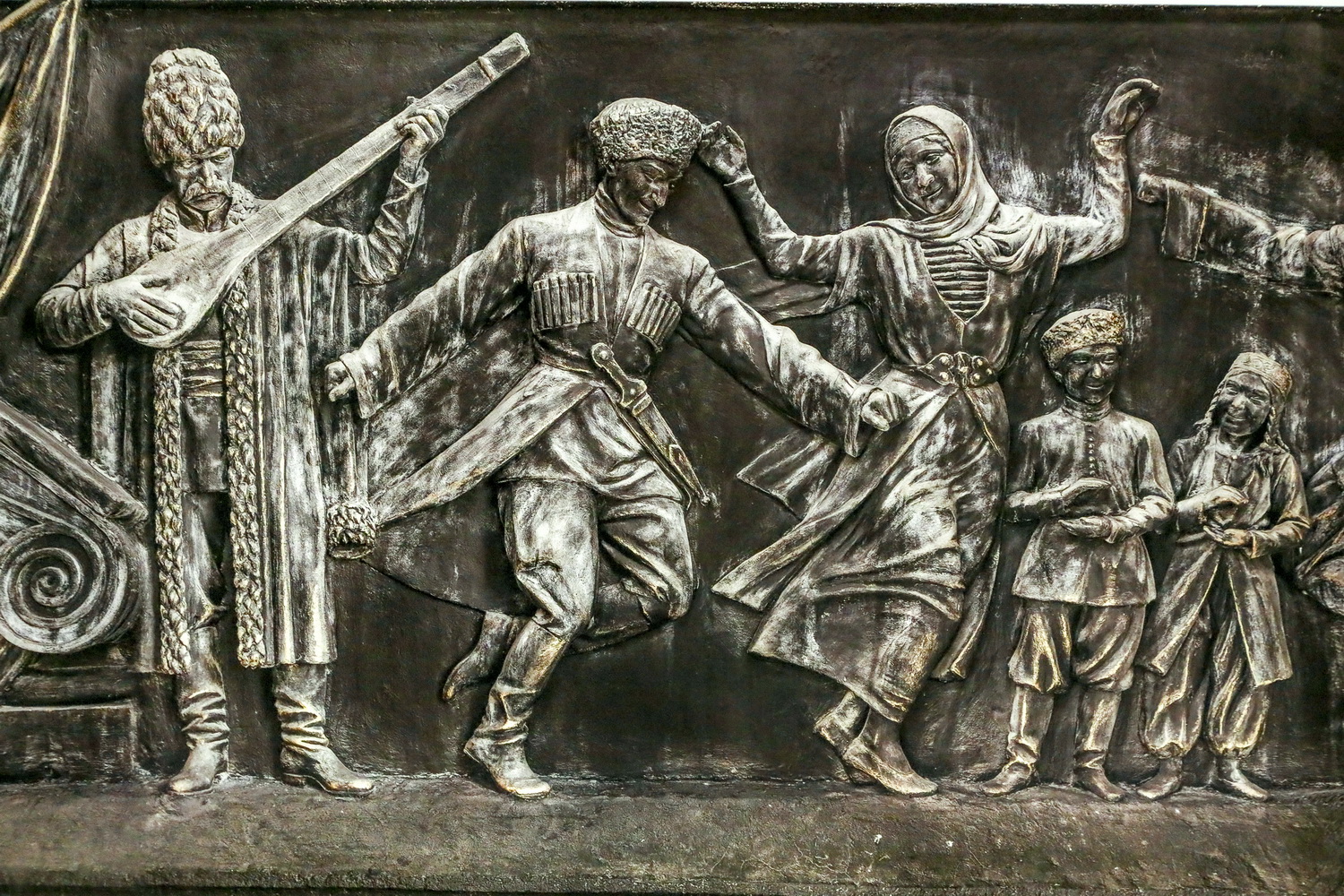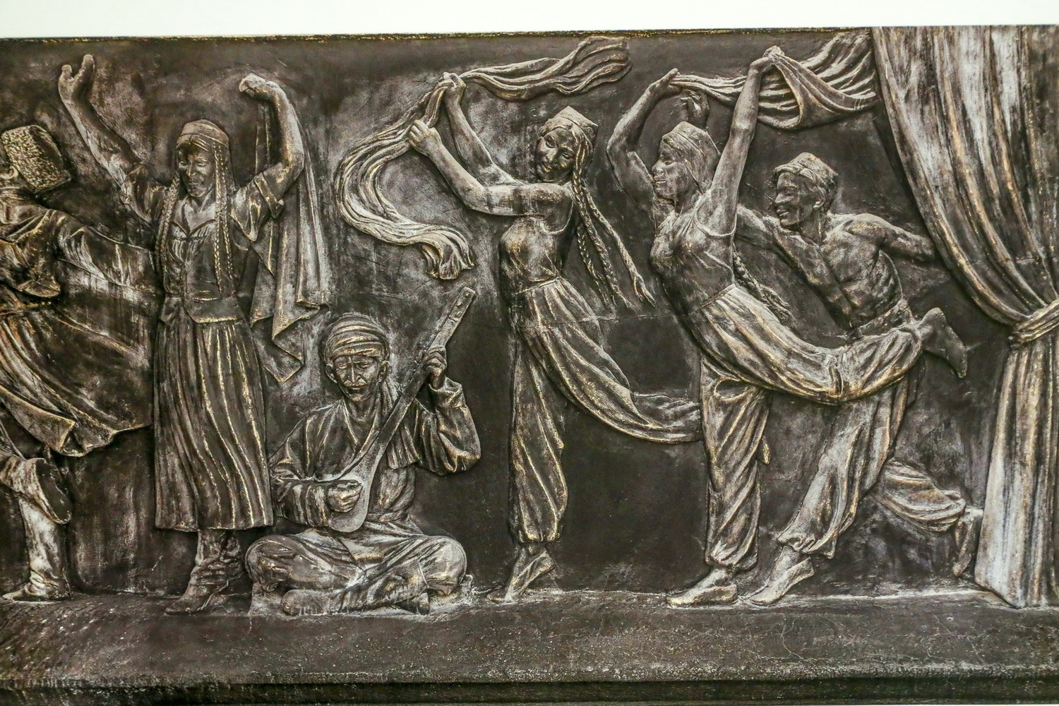 В 1933–1935 годах приняли новый проект здания и тогда же утвердили проект его декоративного оформления. Вера Фёдоровна Штейн и её помощник Василий Ковшов приступили к работе над барельефом не раньше 1937 года. Штейн была автором барельефа, и она всегда на это указывала. Первоначально он назывался «Искусство народов СССР», но затем за ним закрепилось название «Танцы народов СССР». Одной из ключевых тем творчества у советских художников в конце 30-х годов было изображение искусства разных народов СССР. Таков был идеологический запрос.