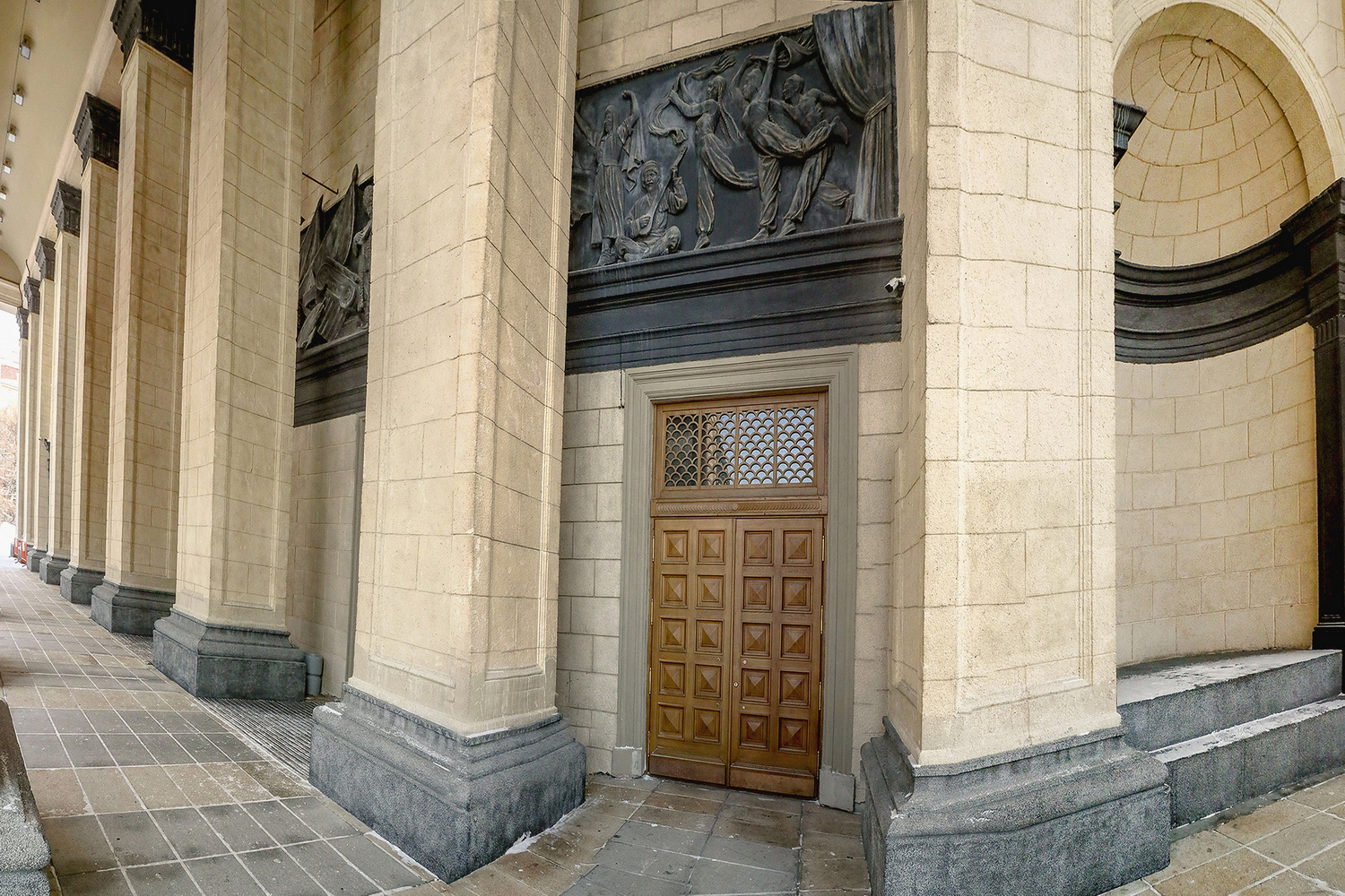 — В процессе корректировок проекта здания барельеф, который должен был быть на виду и поражать зрителей своим масштабом, оказался закрыт колоннами. Нет такого ракурса, с которого можно увидеть всё 22-метровое изваяние целиком. Нет такой точки, с которой мы бы увидели хотя бы его половину. В первоначальном проекте над входной группой, где сейчас размещается барельеф, находилось окно.