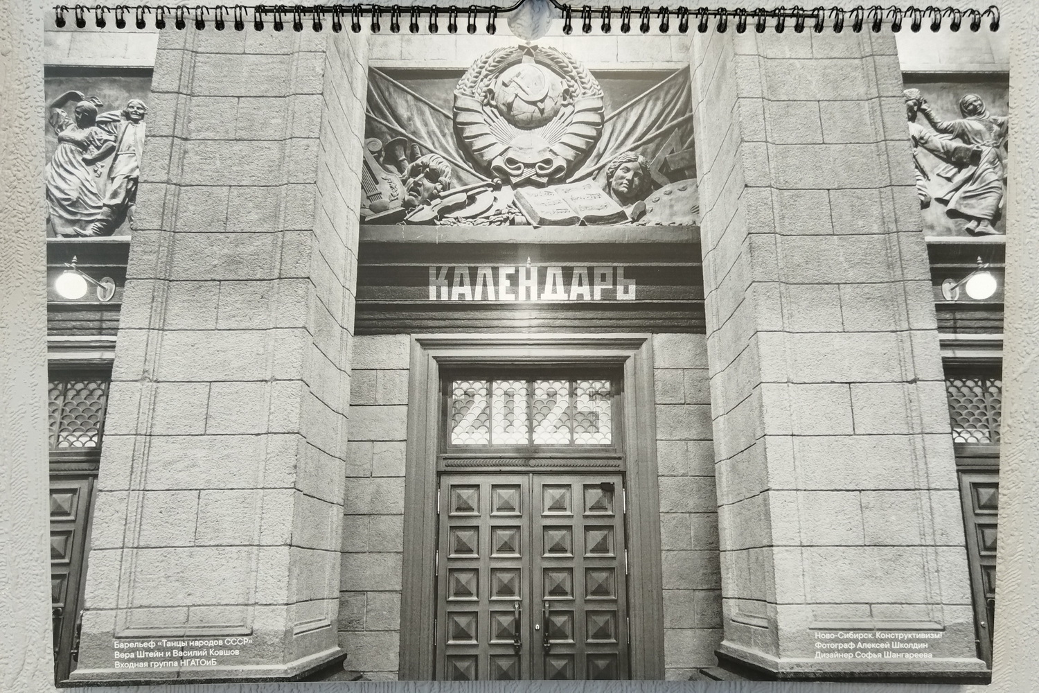 Когда мы выбирали кадр для обложки, то увидели снимок, где видно только центральную часть барельефа — сюжеты по бокам скрыты за двумя колоннами. Это изображение мы и разместили на календаре.