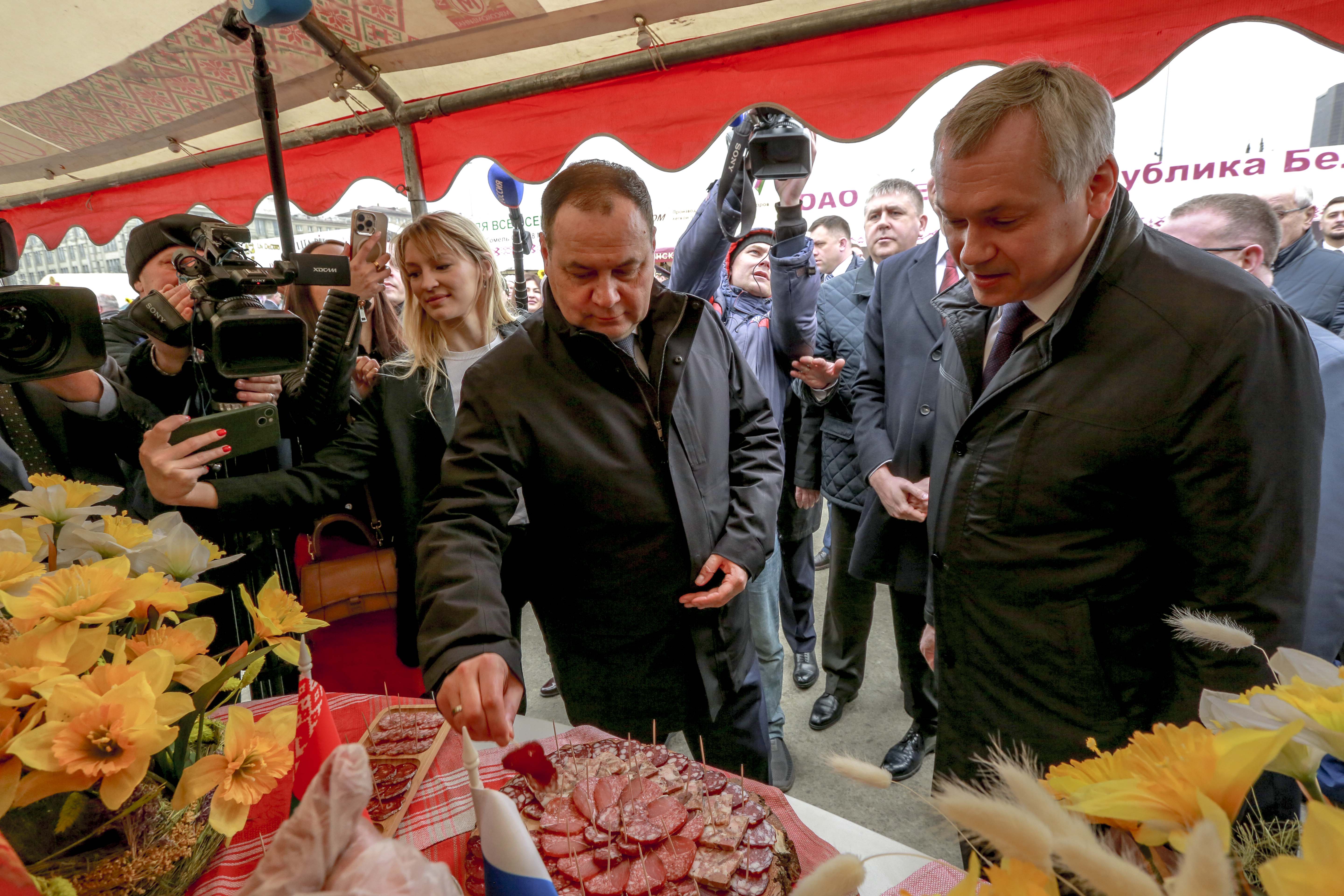 Сегодня, 27 апреля, продукты из Белоруссии продегустировали мэр Анатолий Локоть и губернатор Андрей Травников. Вместе с ними работу торговых рядов проинспектировал премьер-министр дружественной республики Роман Головченко.