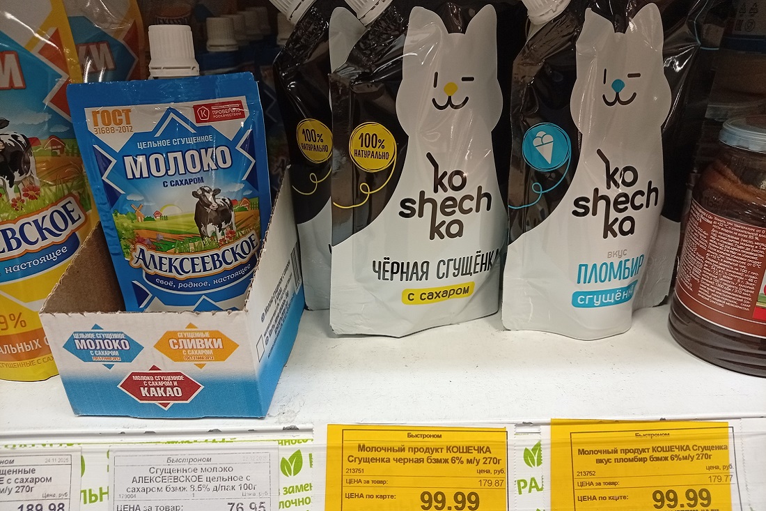 Добавим, что это не единственный необычный продукт, удивляющий новосибирцев этой весной. Так, на полках некоторых супермаркетов выставили чёрную сгущёнку. Производитель утверждает, что это на 100% натуральный продукт. В составе — молоко нормализованное, сыворотка восстановленная, сахар, патока, молочный сахар (лактоза), краситель Е153 — бамбуковый уголь (чёрный порошок без запаха и вкуса).