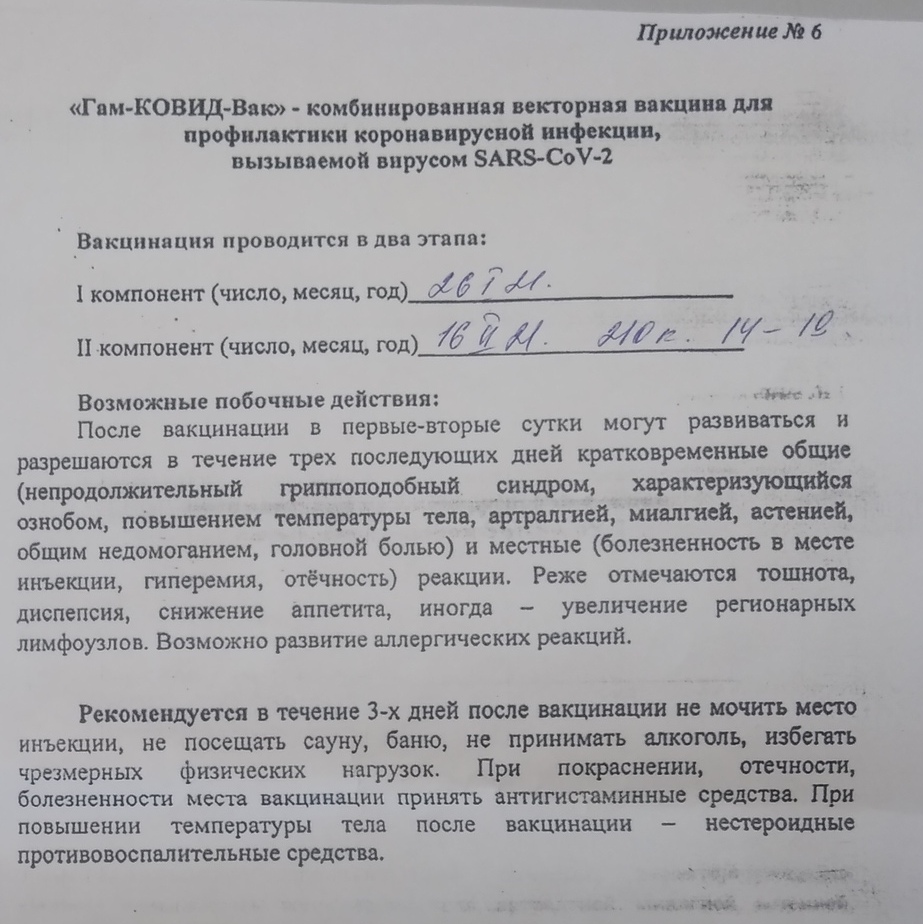 В конце выдают памятку с описанием побочных эффектов и напоминанием, когда прийти за повторной прививкой. Как следует из документа, в первые три дня после укола могут быть озноб, температура и даже снижение аппетита с тошнотой.