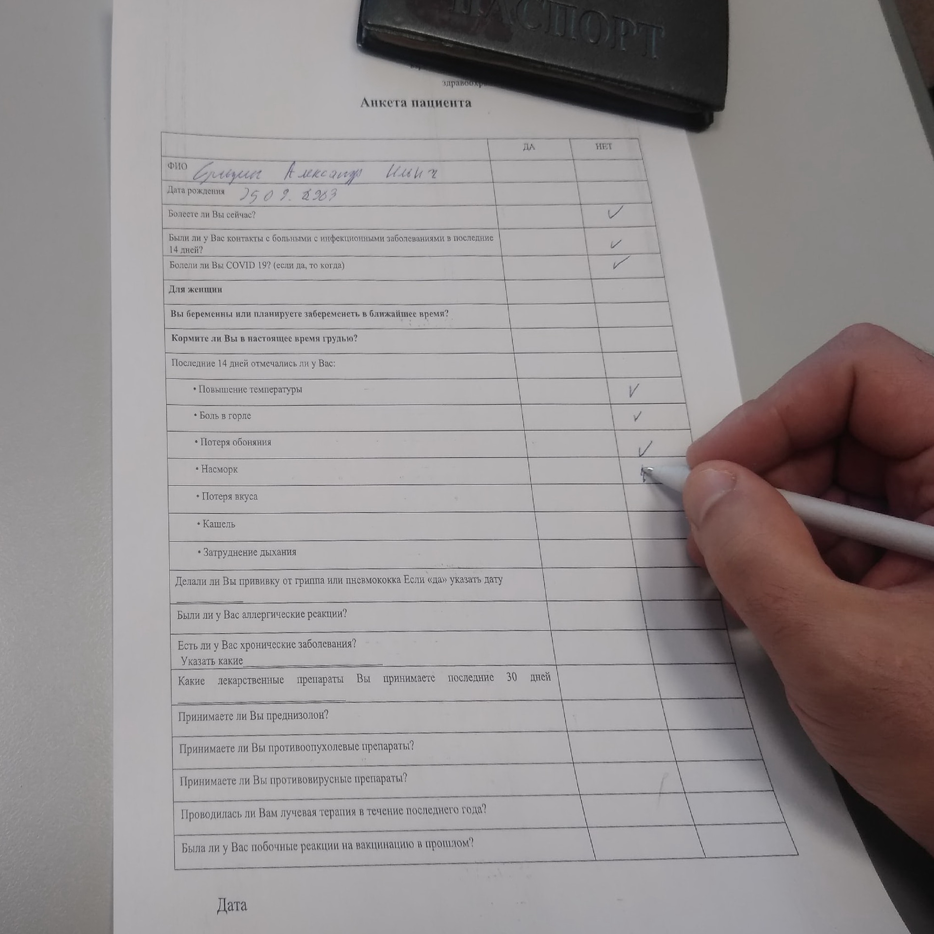В соцсетях распространяли видео, где пациент, придя на прививку, заполняет несколько страниц. В моём случае было не так — весь набор вопросов уместился на одной стороне листа А4.