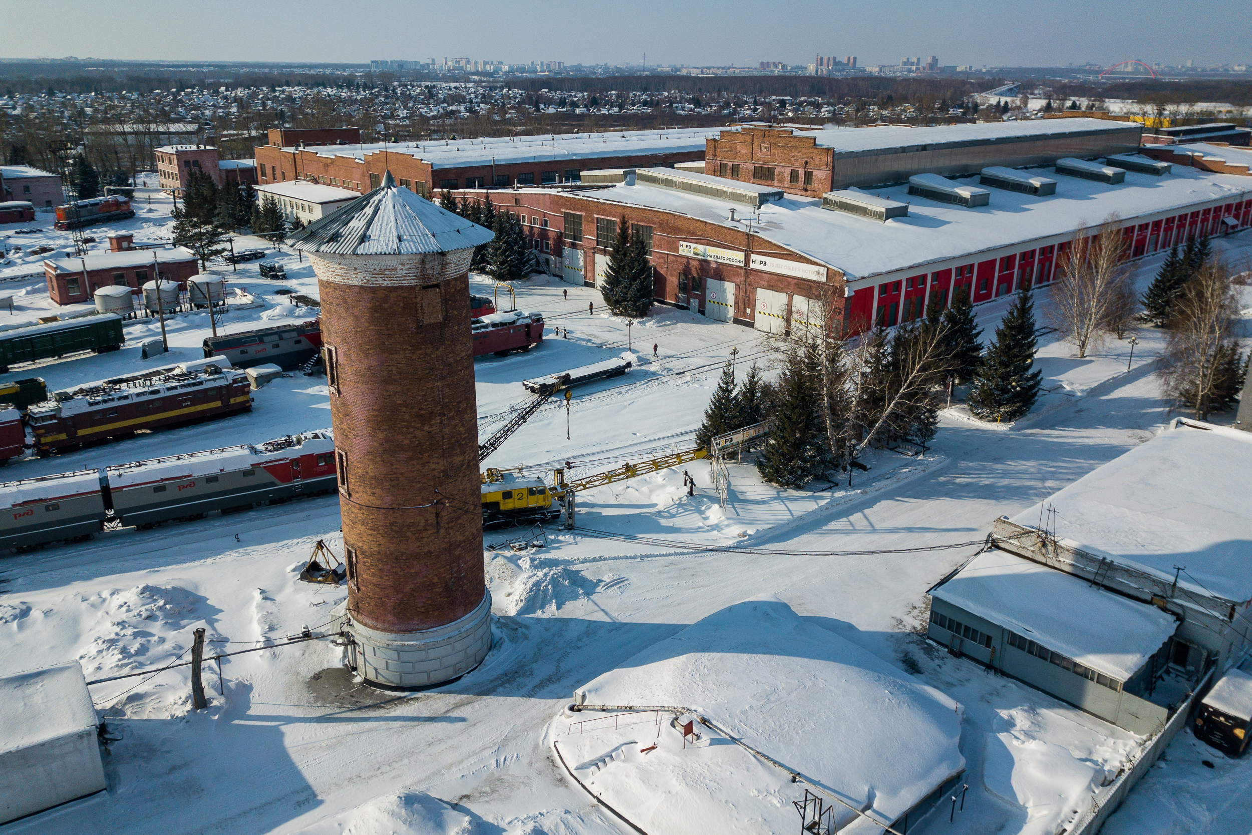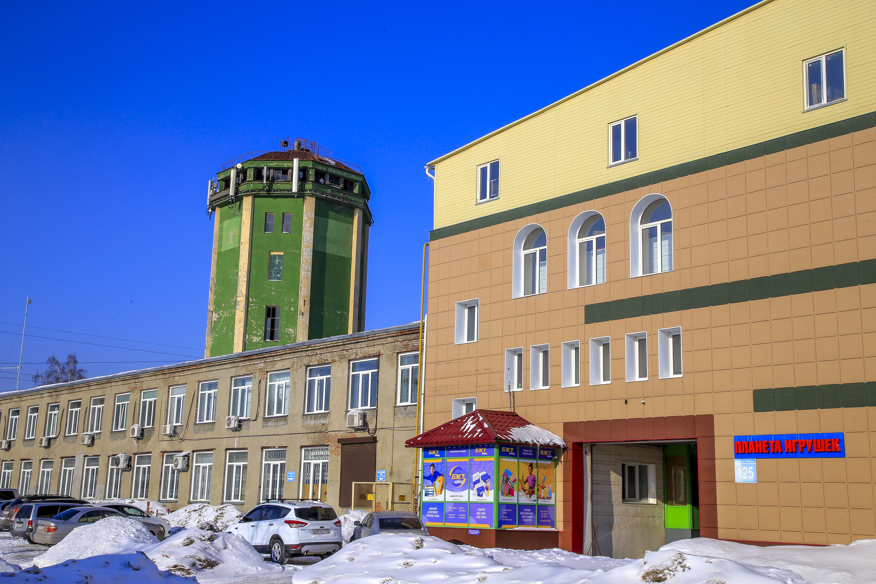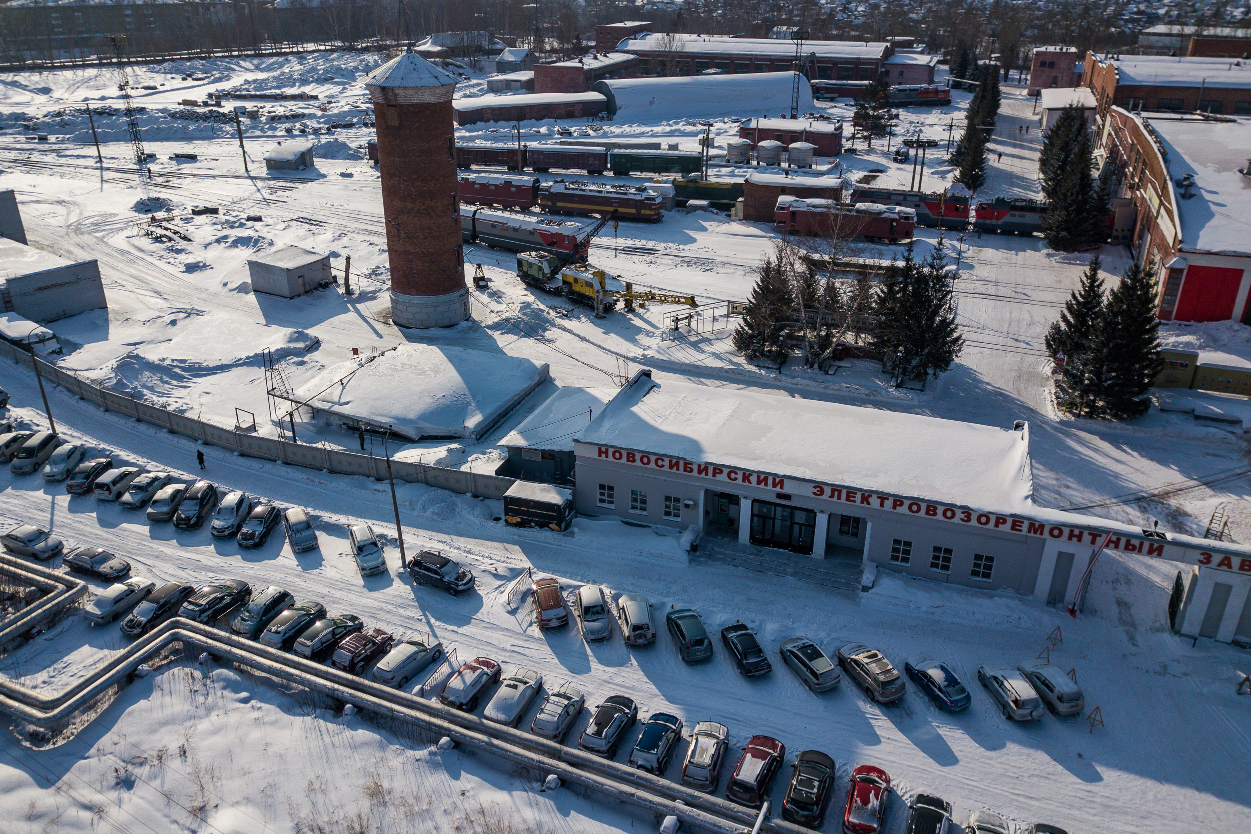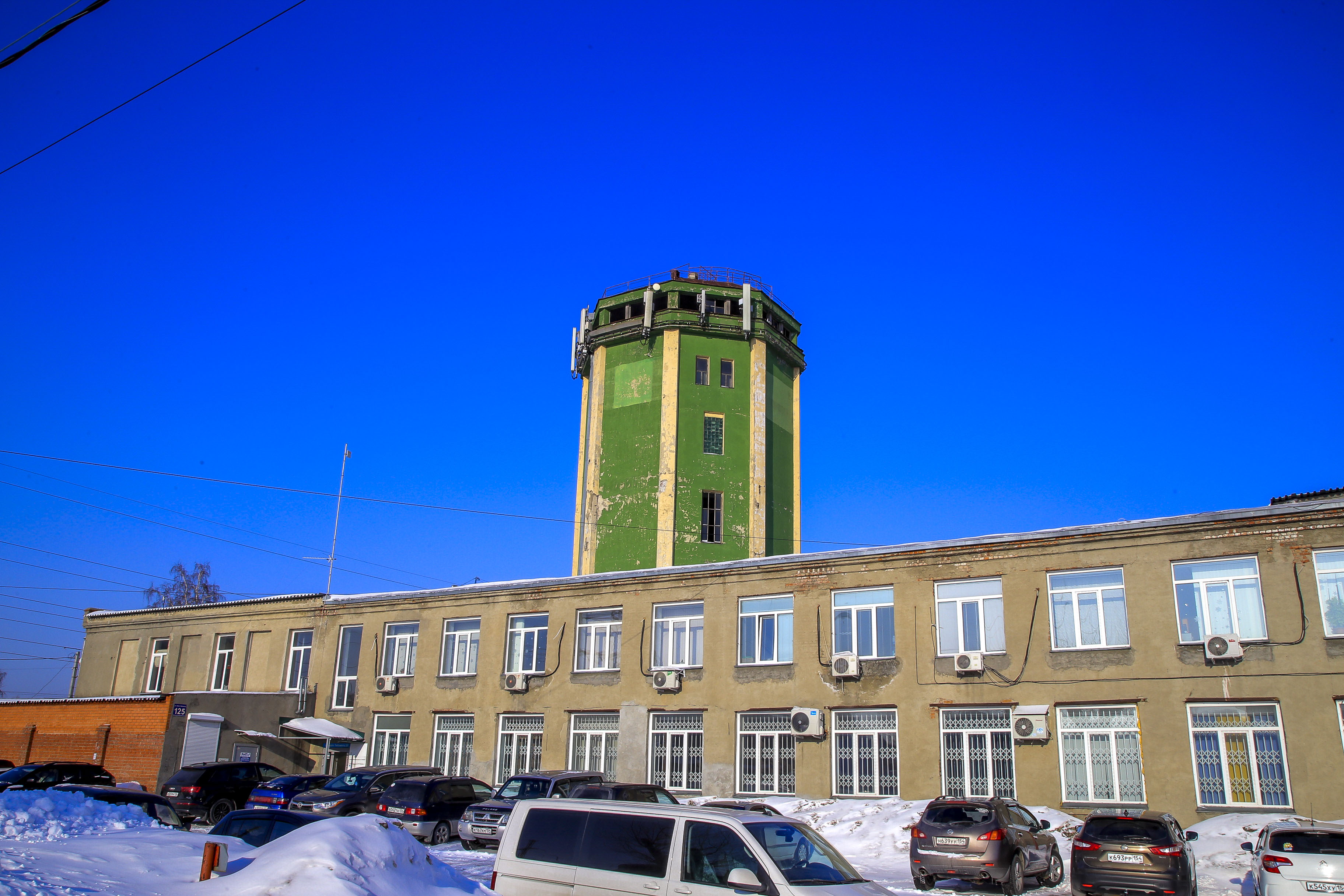 У Новосибирского электровозоремонтного завода (НЭРЗ) есть своя водонапорная башня. Когда-то рядом с ней находился бак с шатром. Сейчас заметно только окно, где был переход из ствола башни на площадку к баку.
