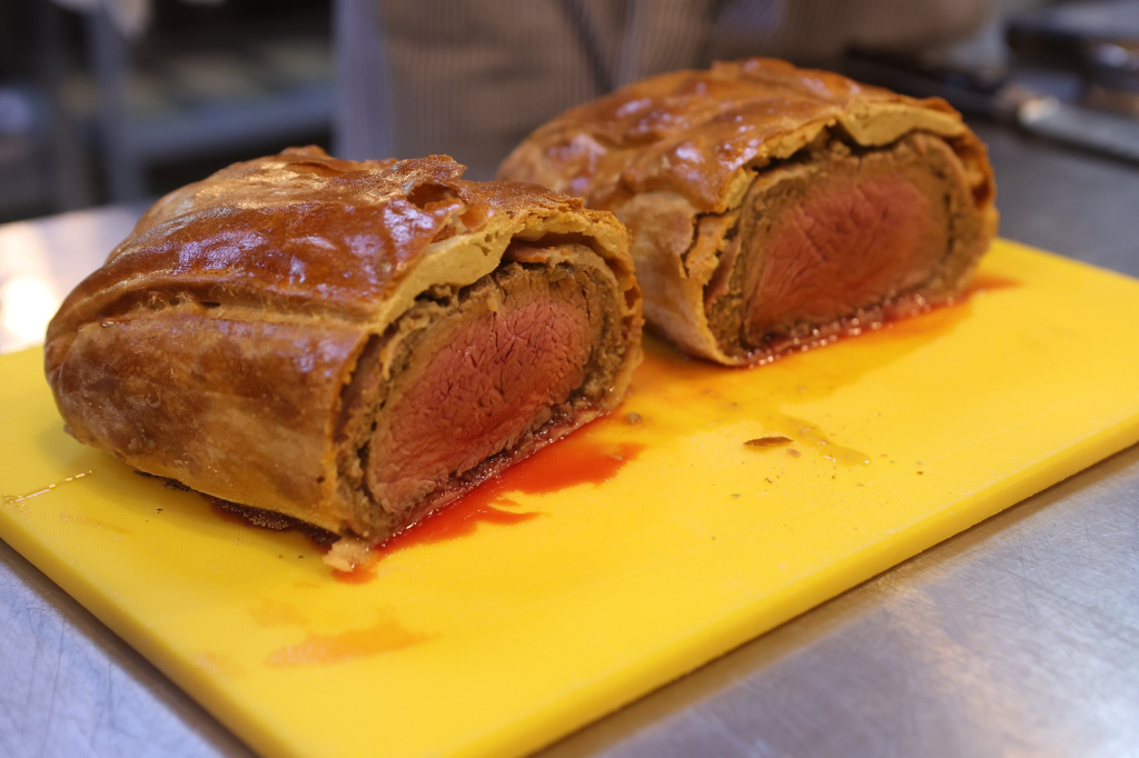 Далее переходим к свинине. Предварительно разогреваем духовку до 190 градусов. На раскалённой сковороде обжариваем корейку целым куском со всех сторон до румяной корочки. При этом важно не довести мясо до готовности, а только «запечатать» его снаружи и оставить сырым внутри.
