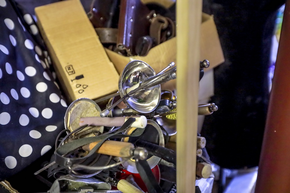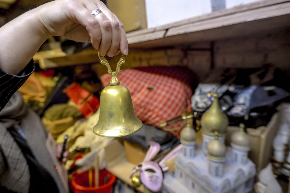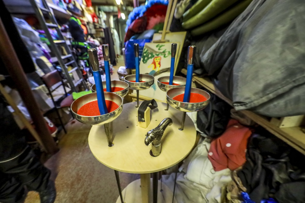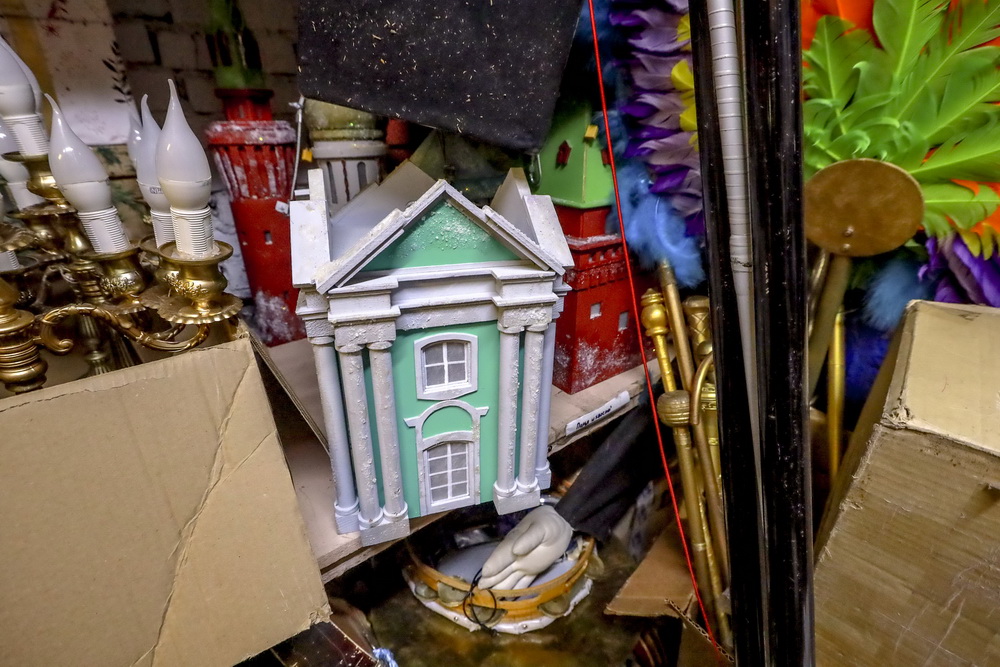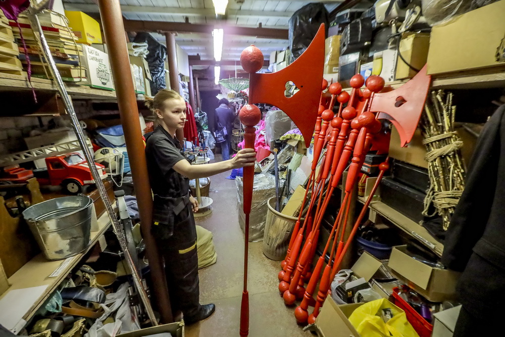Здесь есть шпаги мушкетёров, коробки с деньгами, колбаса и бутерброды с красной икрой, огромная корзина мягких снежков, которыми дети играли на новогодних представлениях. Целый угол выделили для музыкальных инструментов. По словам реквизитора, если как следует поискать, то в залежах можно обнаружить больше десятка самоваров и столько же разномастных фотоаппаратов.