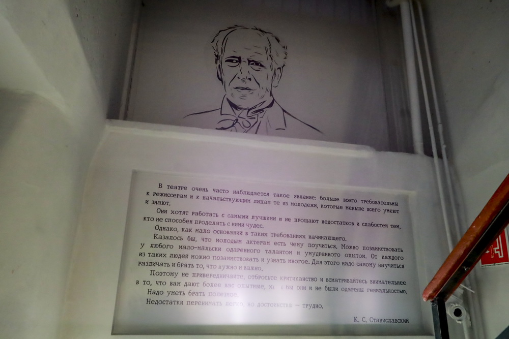 Переходя по лестницам с этажа на этаж, на торцевых стенах можно увидеть портреты великих театральных режиссёров Константина Сергеевича Станиславского и Евгения Багратионовича Вахтангова.