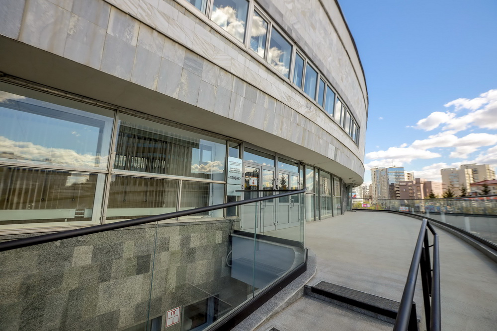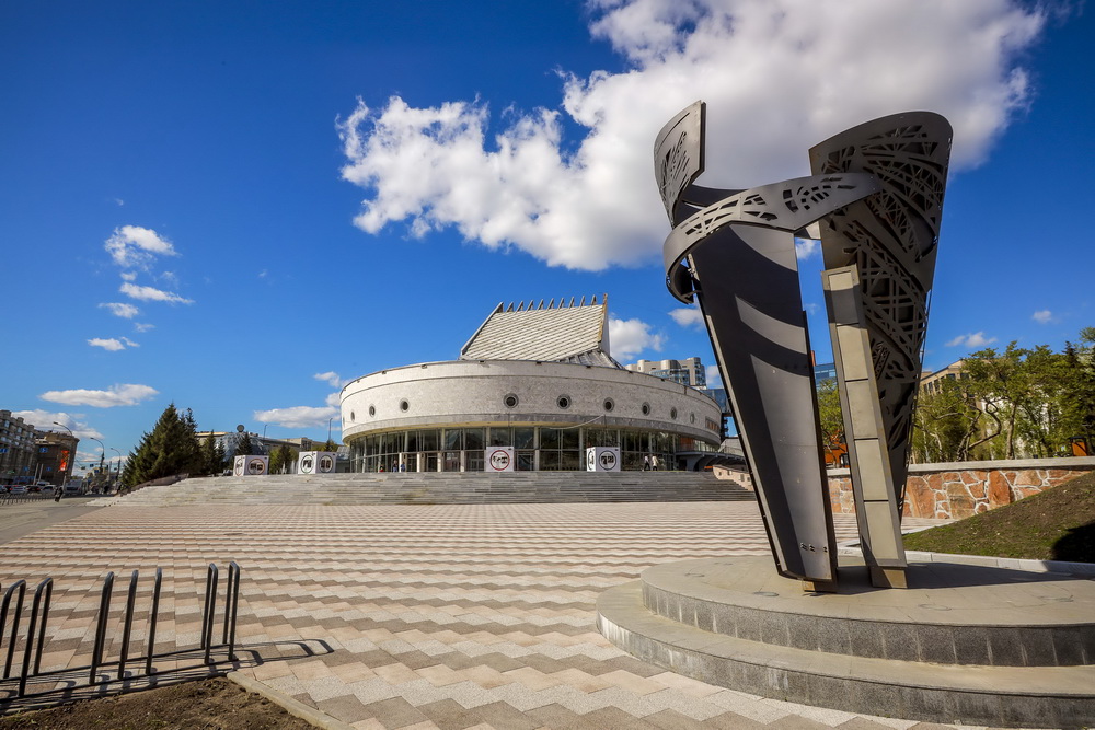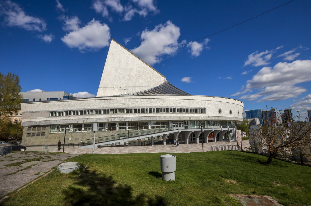 Кровлю здания, площадь которой 2000 кв. метров, держит трёхмерная тросовая система, образующая сложную геометрическую поверхность. Фасад облицован светло-серым мрамором с Саяно-Шушенского месторождения. Окна верхнего фойе выполнены в форме иллюминаторов корабля. Входы для зрителей находятся на первом этаже. В служебный вход, расположенный на втором, ведёт изящная пешеходная эстакада.