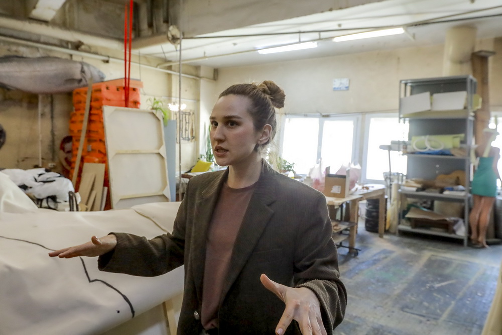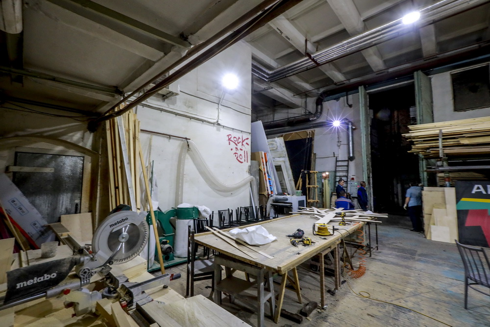 «Готовую декорацию мы обрабатываем специальным противопожарным составом. Затем она проходит все проверки, и после этого на тельфере её опускают на большую сцену», — поясняет специалист.