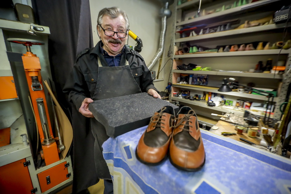Обувщик Сергей Минин трудится здесь уже десять лет. А в обувном деле он с 1984 года. Рабочие инструменты мастера — это очень острые ножи, клещи, молоток, гвозди и стойка.