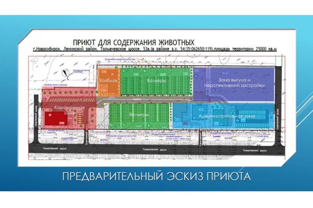 Как сообщил официальный телеграм-канал мэрии Новосибирска, участок под приют нашли в промышленной зоне. Он покрыт древесно-кустарниковой растительностью, которую решено частично сохранить по периметру приюта, в зоне выгула и перспективного развития. Предварительно в проекте комплекс разделили на административную и карантинную зоны, хозблок, вольеры, зону выгула и перспективной застройки.