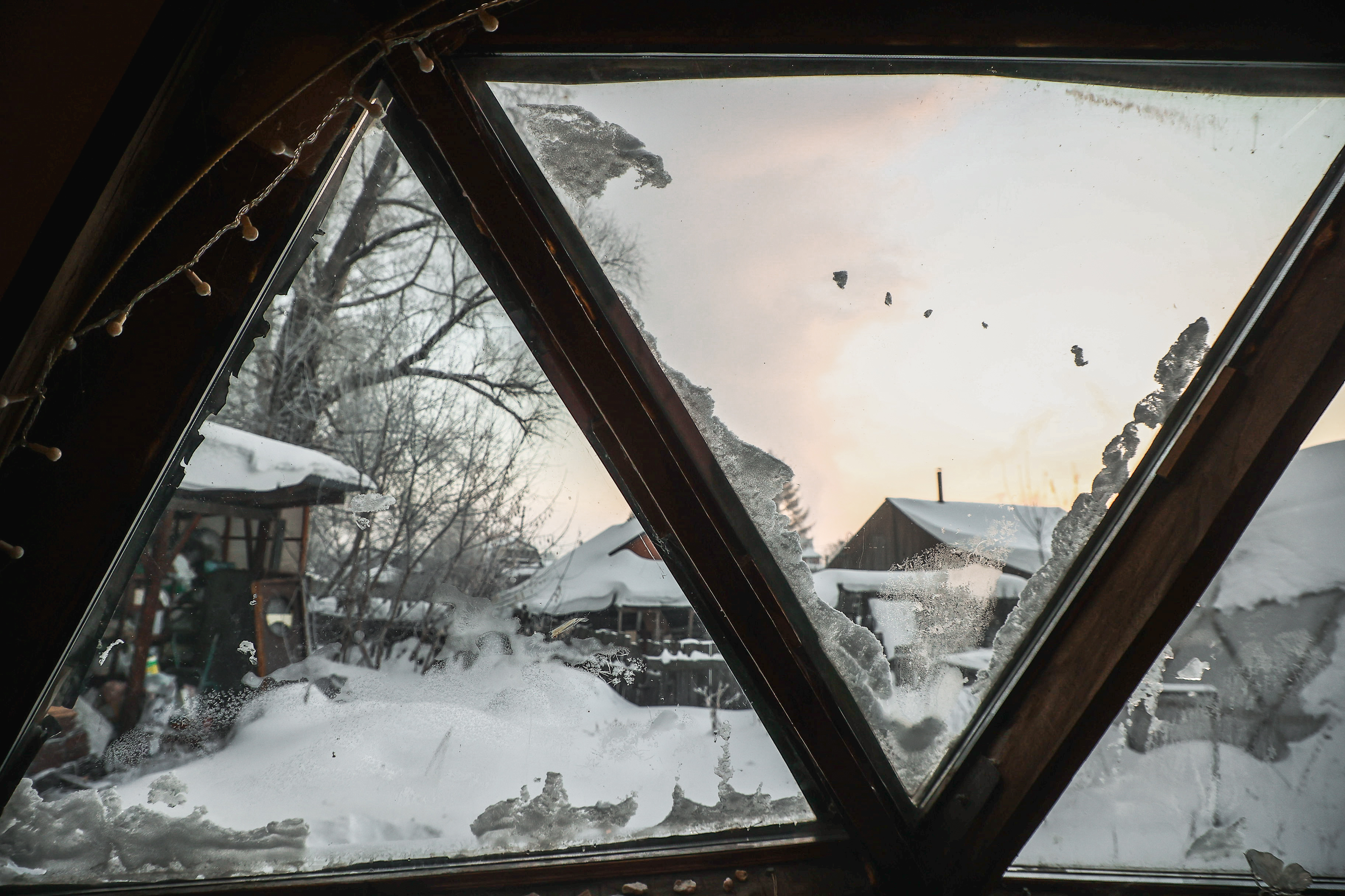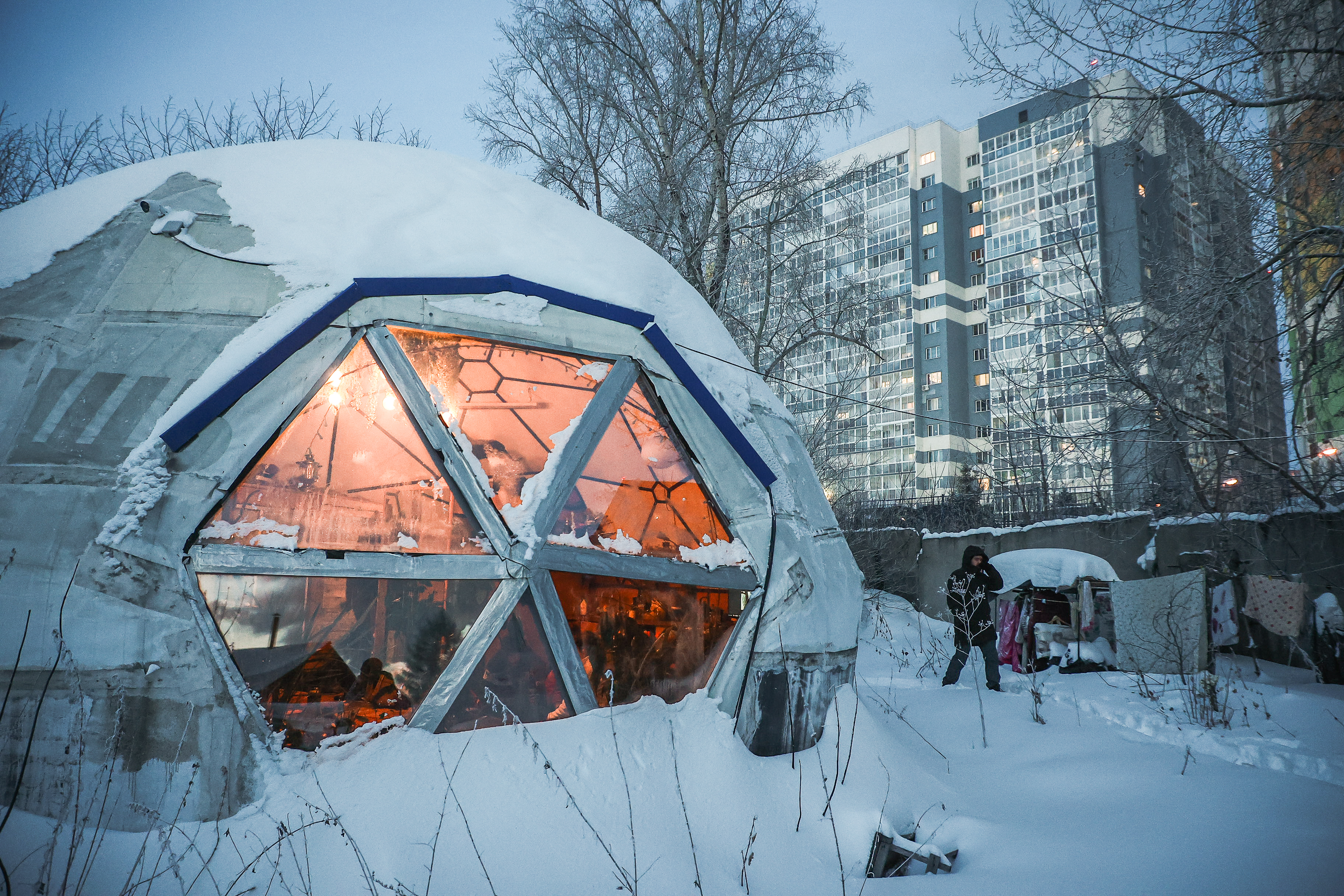 К слову, дом «Сфера» тоже можно смело назвать экспонатом выставки «Холодно». Это первое купольное здание, созданное в Новосибирске по такой технологии. Иван Мазуренко рассказал, что строили конструкцию несколько лет, а годом ввода в эксплуатацию стал 2012-й. Здесь живёт мама Ивана Людмила. Рядом, во дворе, находится теплица в аналогичном стиле. Два объекта, засыпанные снегом, похожи одновременно на эскимосские иглу и на фантастическую марсианскую станцию.