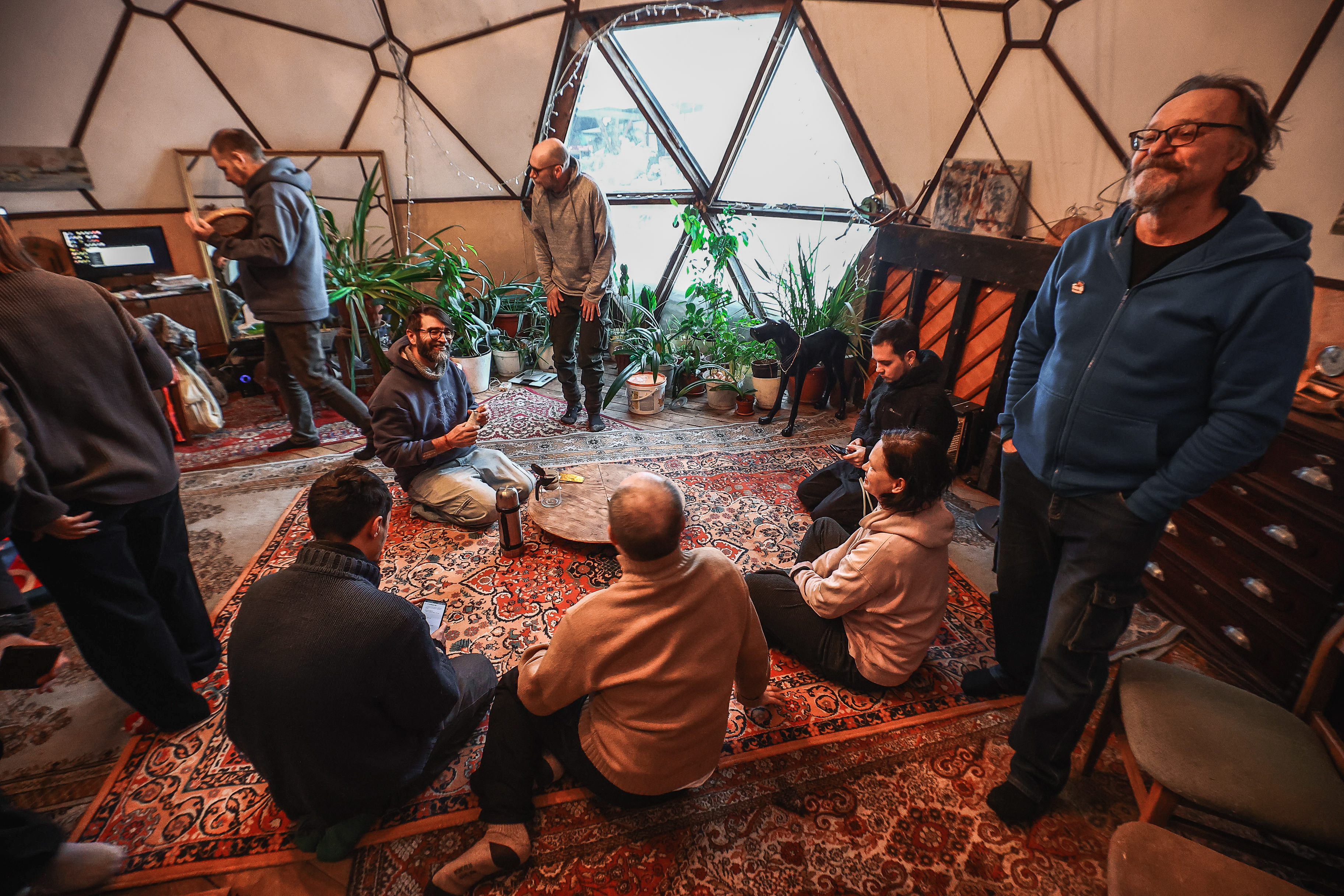 После достаточно быстрой экскурсии по экспозиции гости переместились в дом-сферу, где согревались чаем и комбучей, а также слушали концерт в исполнении забежавших на огонёк музыкантов.