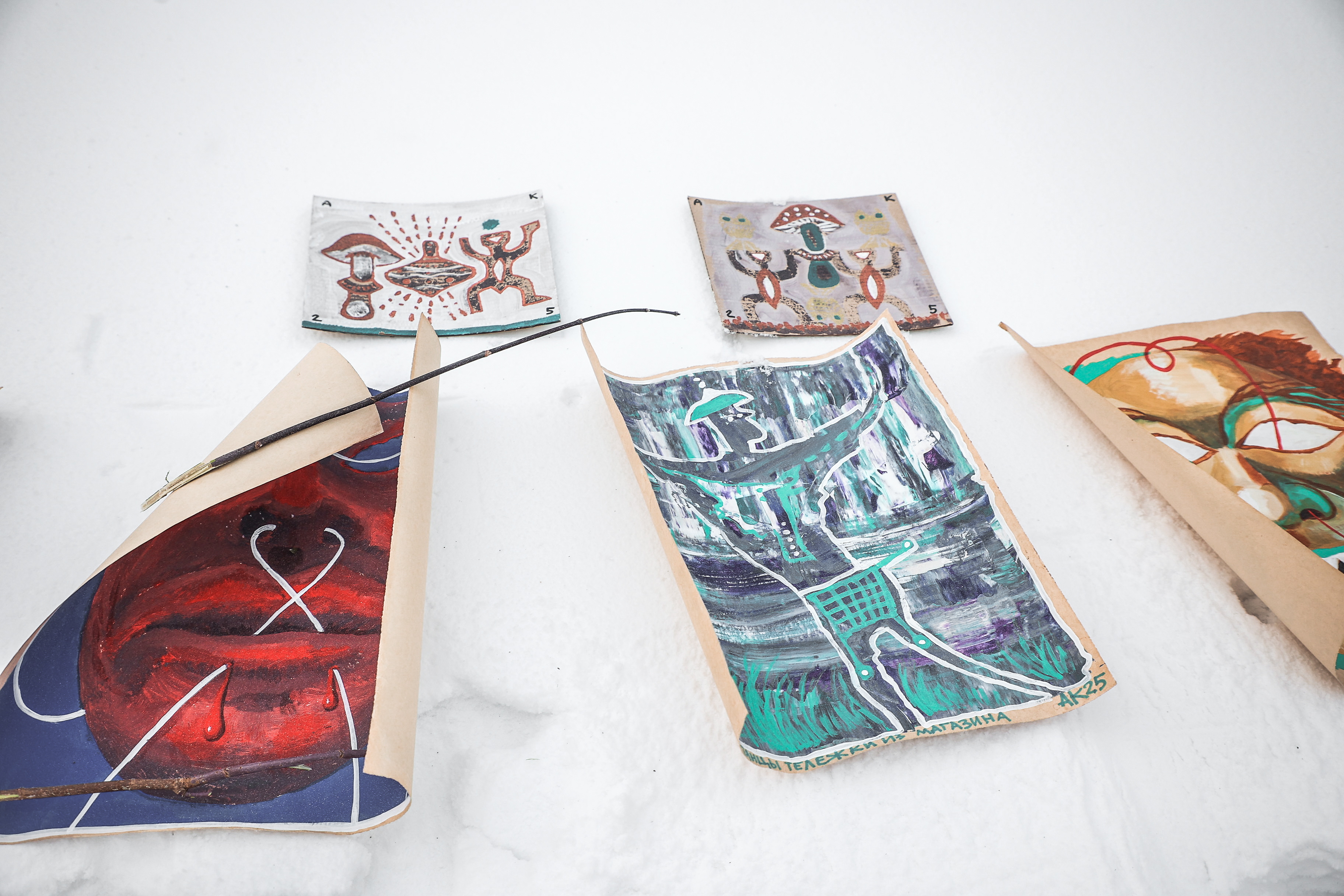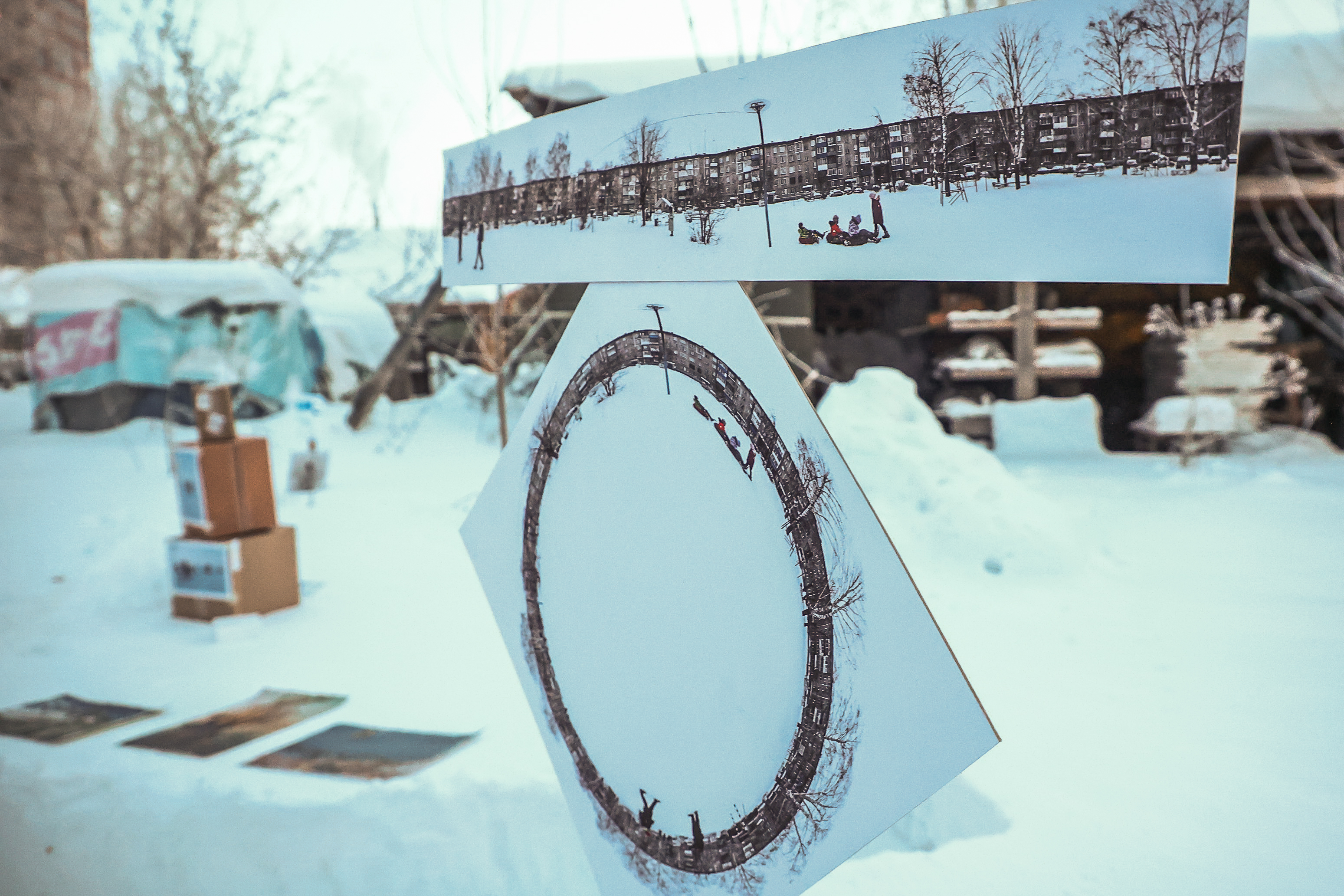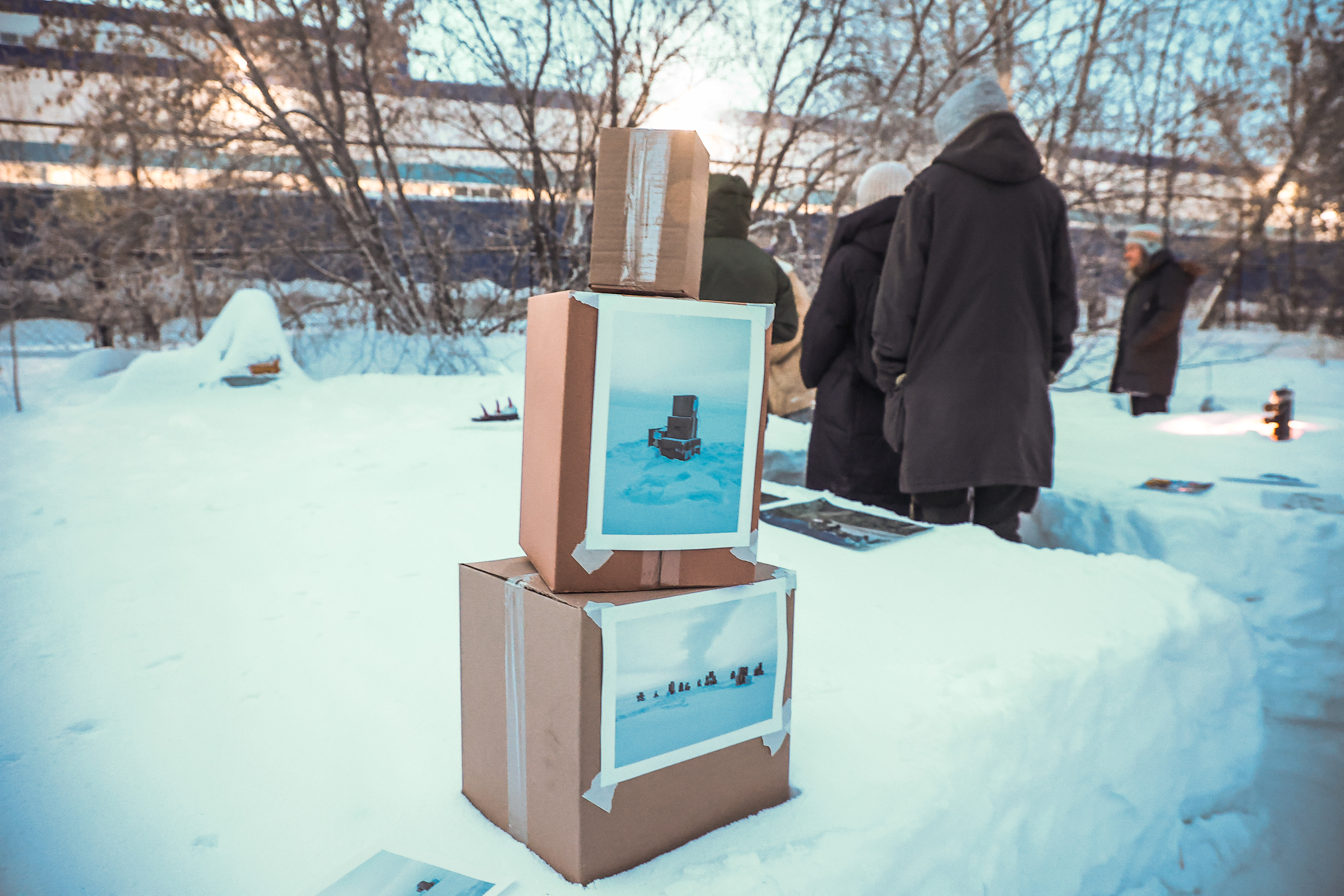 Прямо на снегу у дома поместили работы художников, фотографов и скульпторов. Свои произведения предоставили Слава Мизин, Филипп Крикунов, Никита Овсюк, Андрей Курченко, Алена Залуцкая, Дамир Муратов, Лукас Пуш.