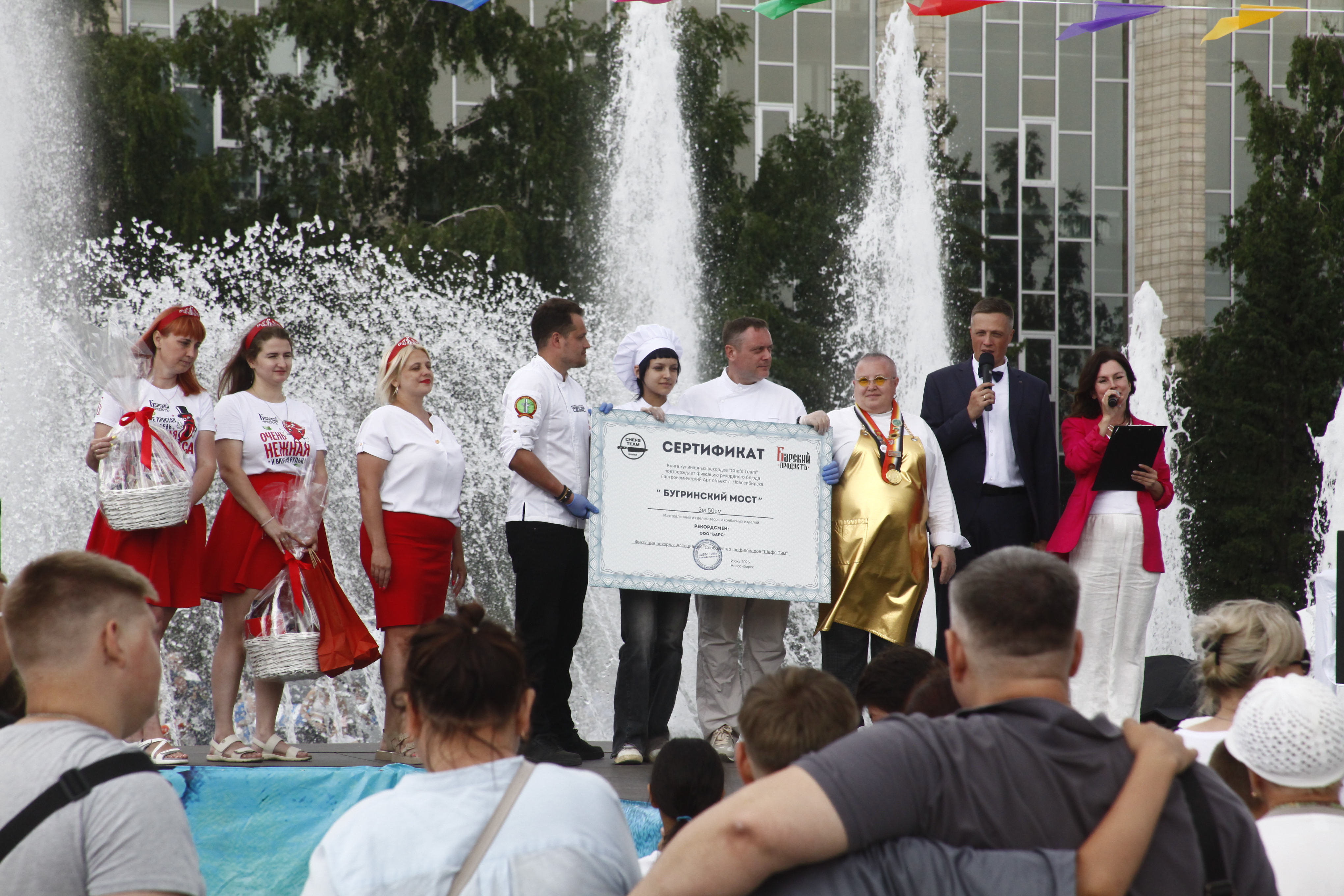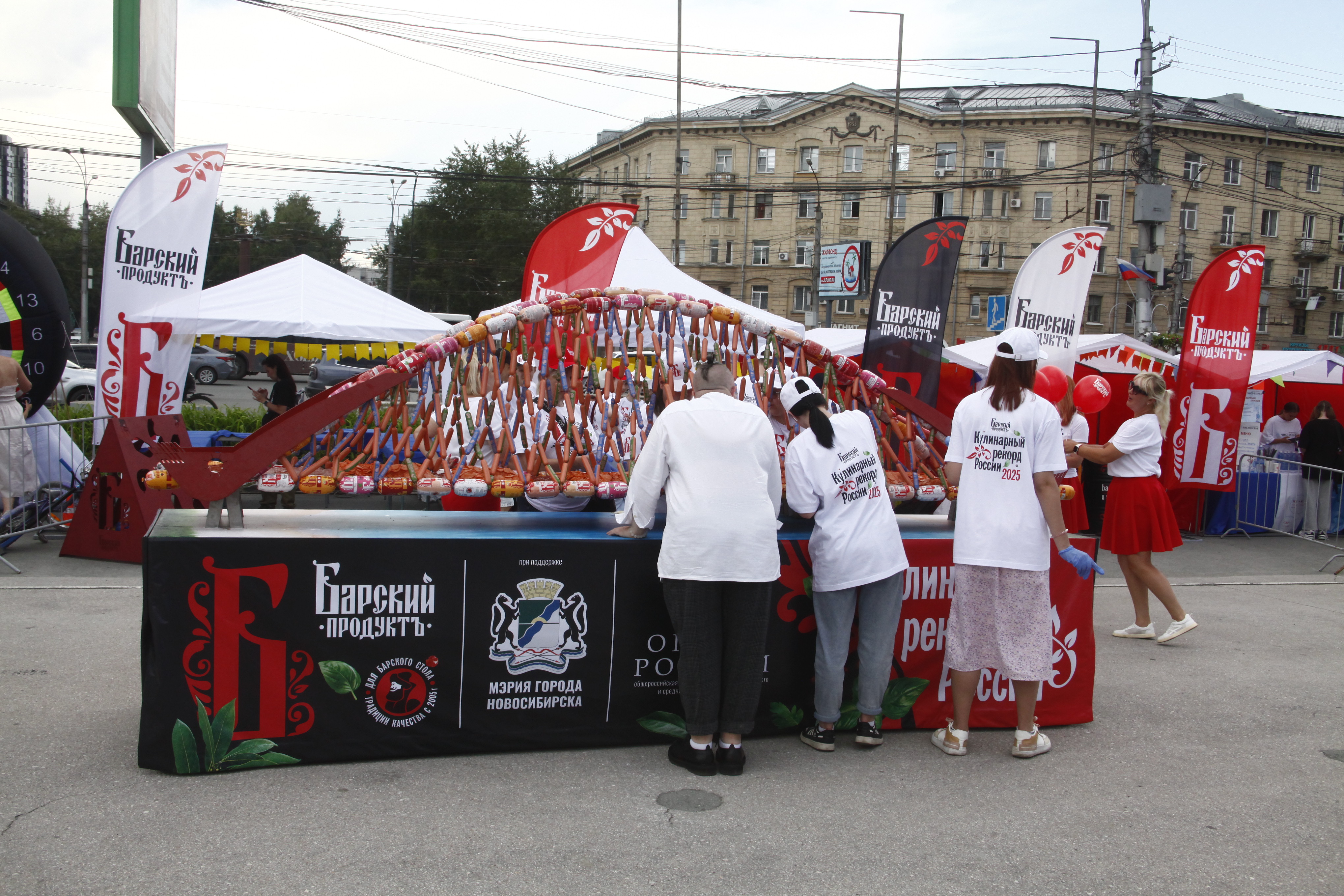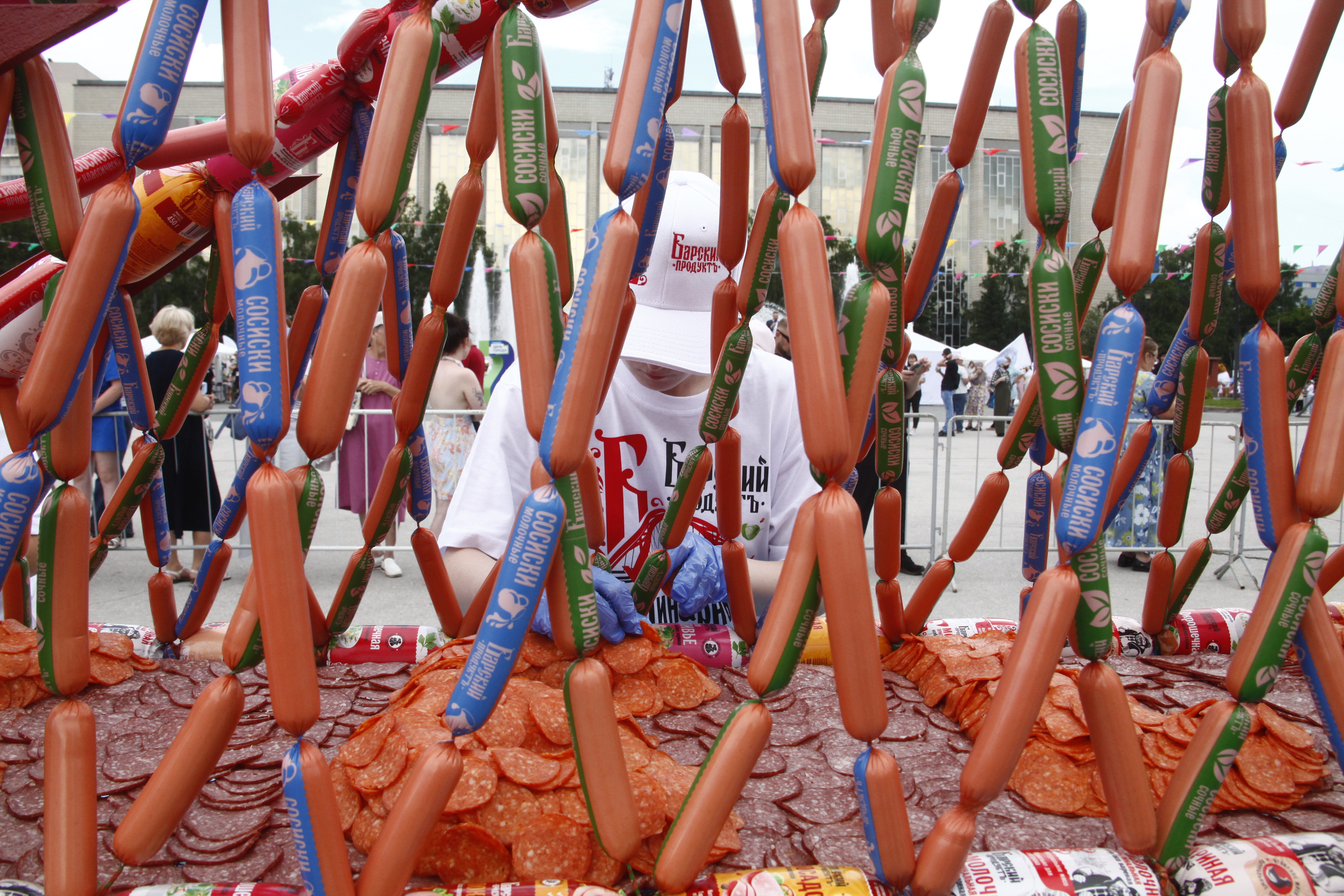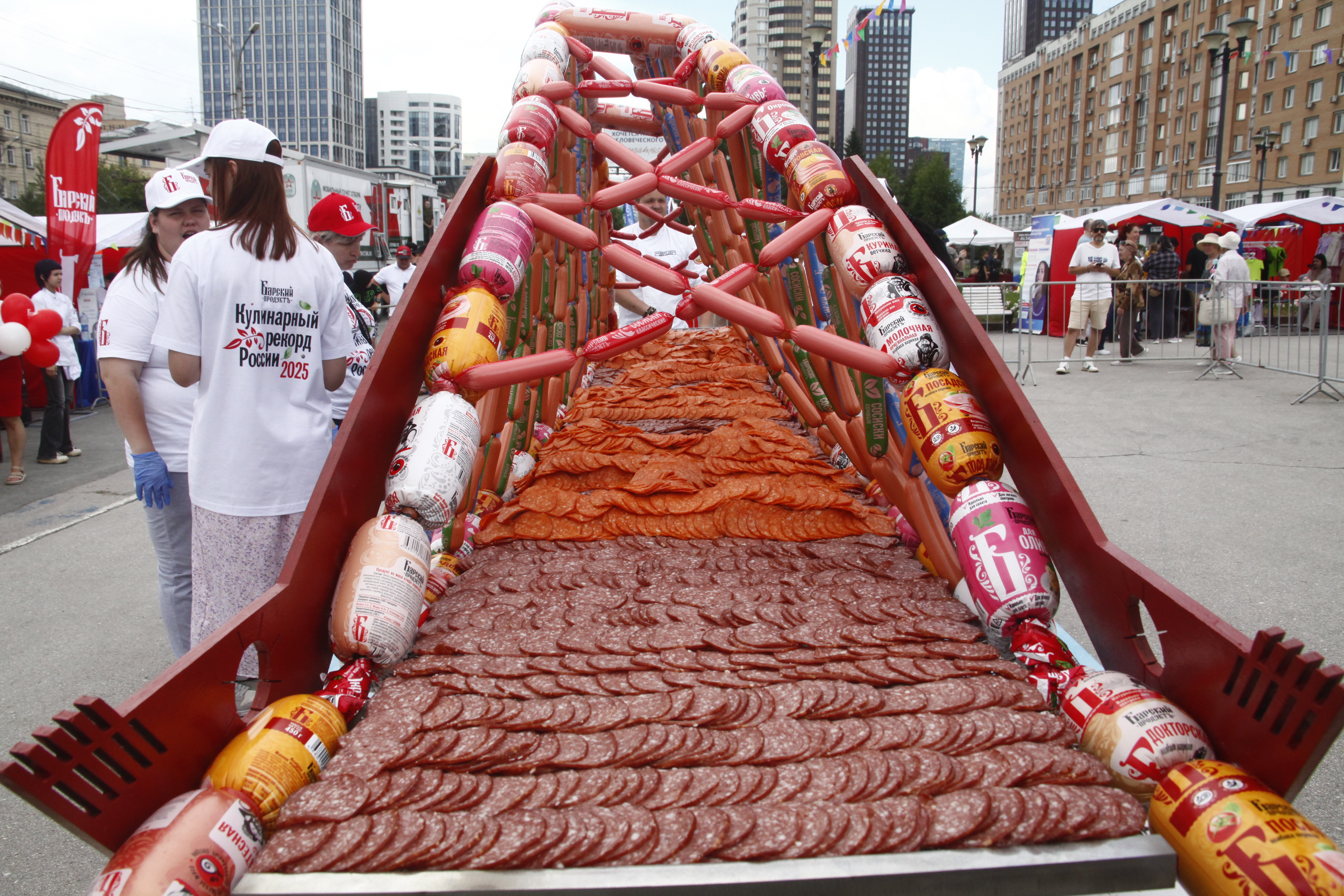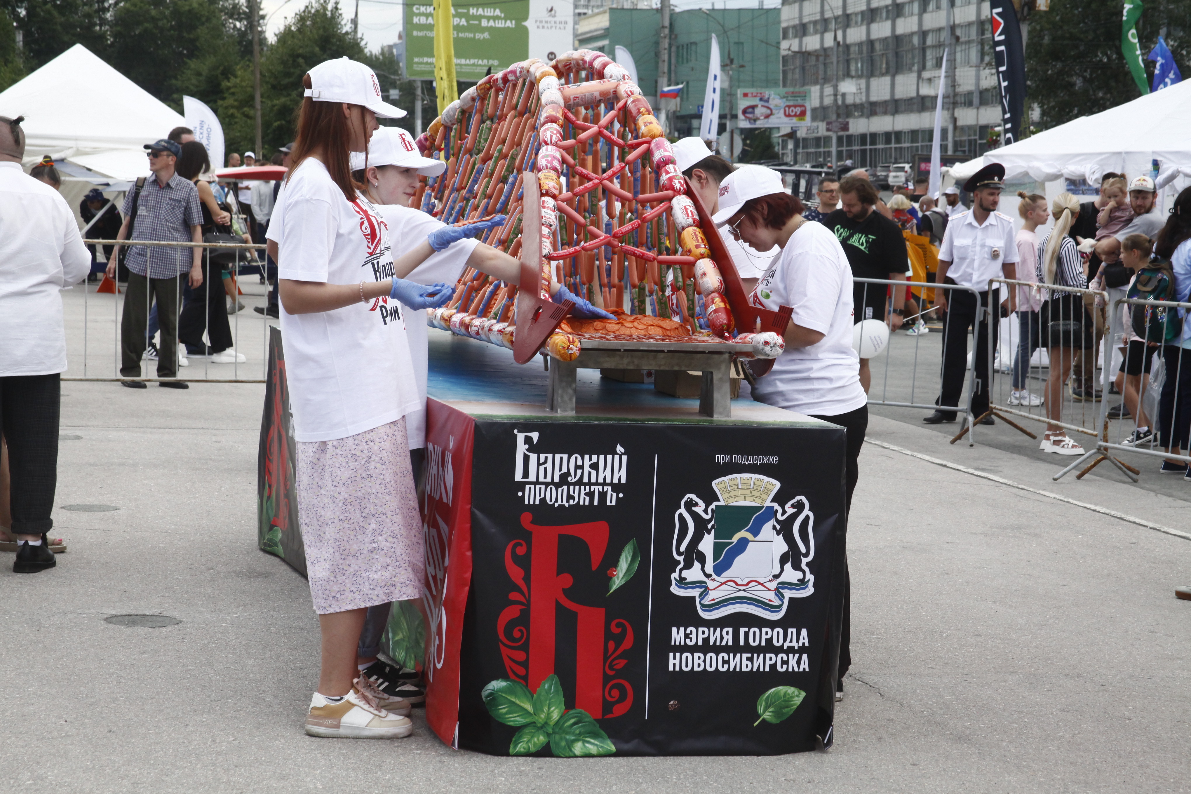 Публике демонстрируют кулинарный рекорд — Бугринский мост, сделанный из колбасы и сосисок.