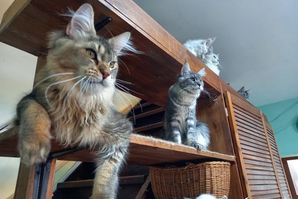 Вес взрослого мейн-куна может достигать 15 кг, а кисточки на ушах и грозное выражение морды делают их похожими на диких животных. Но впечатление о суровом характере обманчиво — мейн-куны любят людей, хозяева в шутку называют их «котопёс».