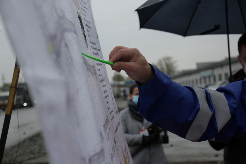 «Вот здесь у нас Краузе, вот здесь Охотская. Вся проезжая часть у нас была двухполосная. Мы уширение делаем вот сюда, от нас — вправо. Дополняем две полосы дороги. Включая железнодорожный переезд с устройством островка безопасности», — объяснил подрядчик.