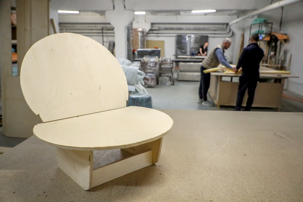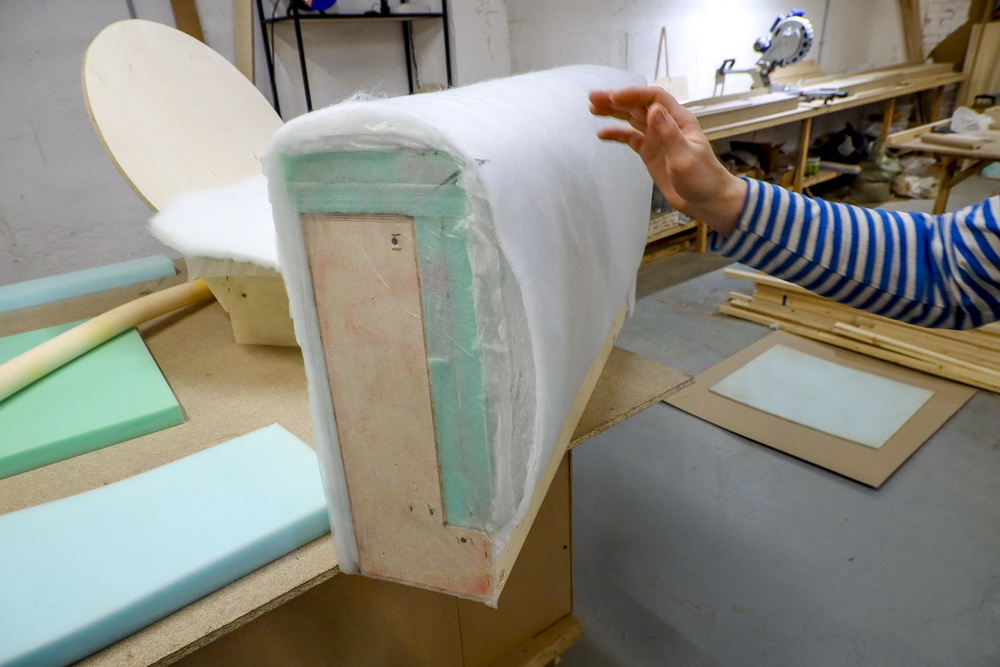 Сначала для кресла изготавливают каркас. Для этого на станке вырезают детали из берёзовой фанеры и собирают их в единую конструкцию. Вторым этапом её обшивают несколькими слоями поролона, чтобы сделать сиденье более удобным.