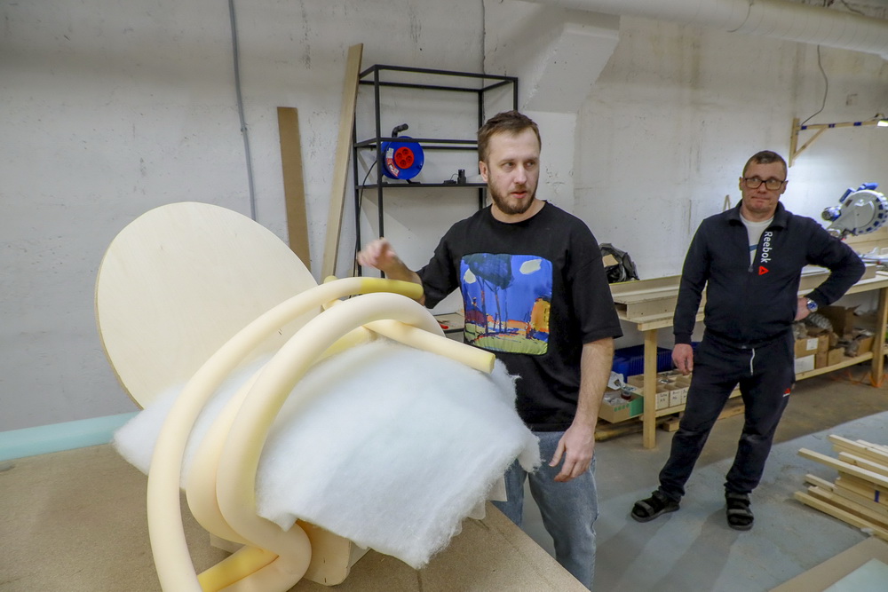 «Кресло мы сделали в очень сжатые сроки, это полностью наша разработка. Получилась дизайнерская вещь. Нам предлагали назвать его „лапоть“, но нам это название не очень понравилось, и мы назвали его „клубок“», — рассказал Антон Павлюк.