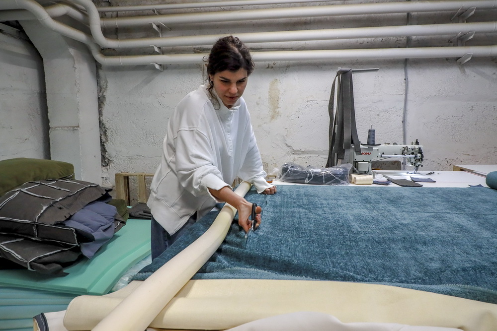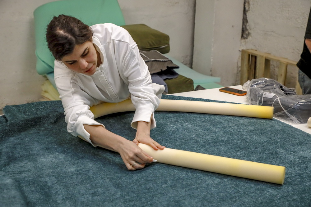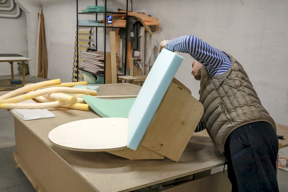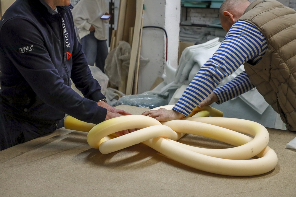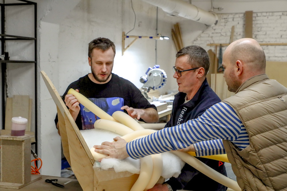 Самый сложный этап — это плетение. Для этого требуется сразу несколько сотрудников, которые формируют из поролоновых «колбасок» объём и надёжно прикрепляют его к каркасу. Для чехлов использовали четыре вида ткани, подбирая их по цвету и фактуре.