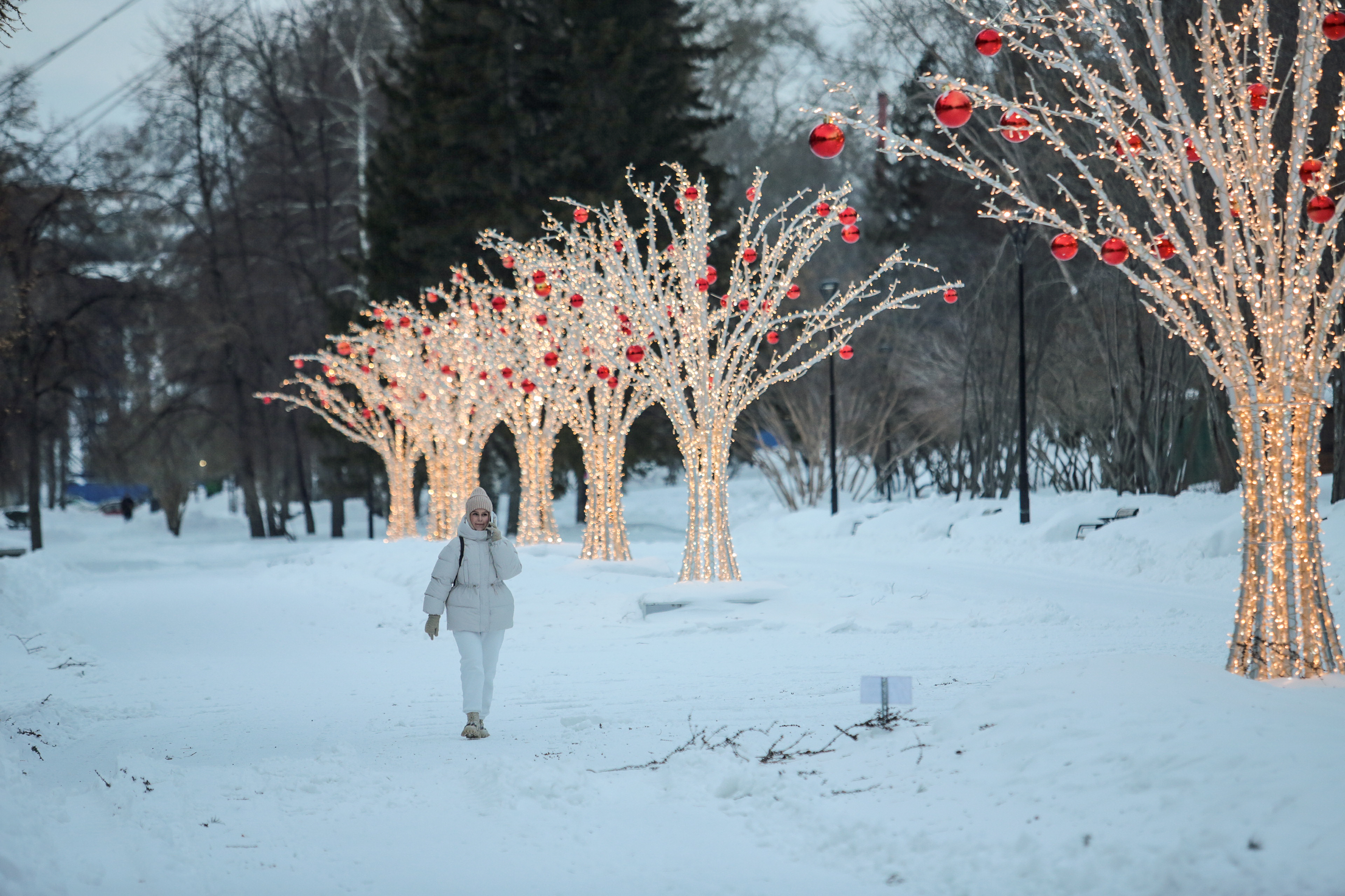 Аллея верхнего променада украшена новогодними деревьями и декорациями с подсветкой, которая работает и днём, и вечером. Здесь приятно прогуляться, сделать красивые зимние кадры в окружении сказочных фотолокаций, посидеть на яркой скамейке-полумесяце, а затем перекусить и согреться в уютных кафе с видом на реку.