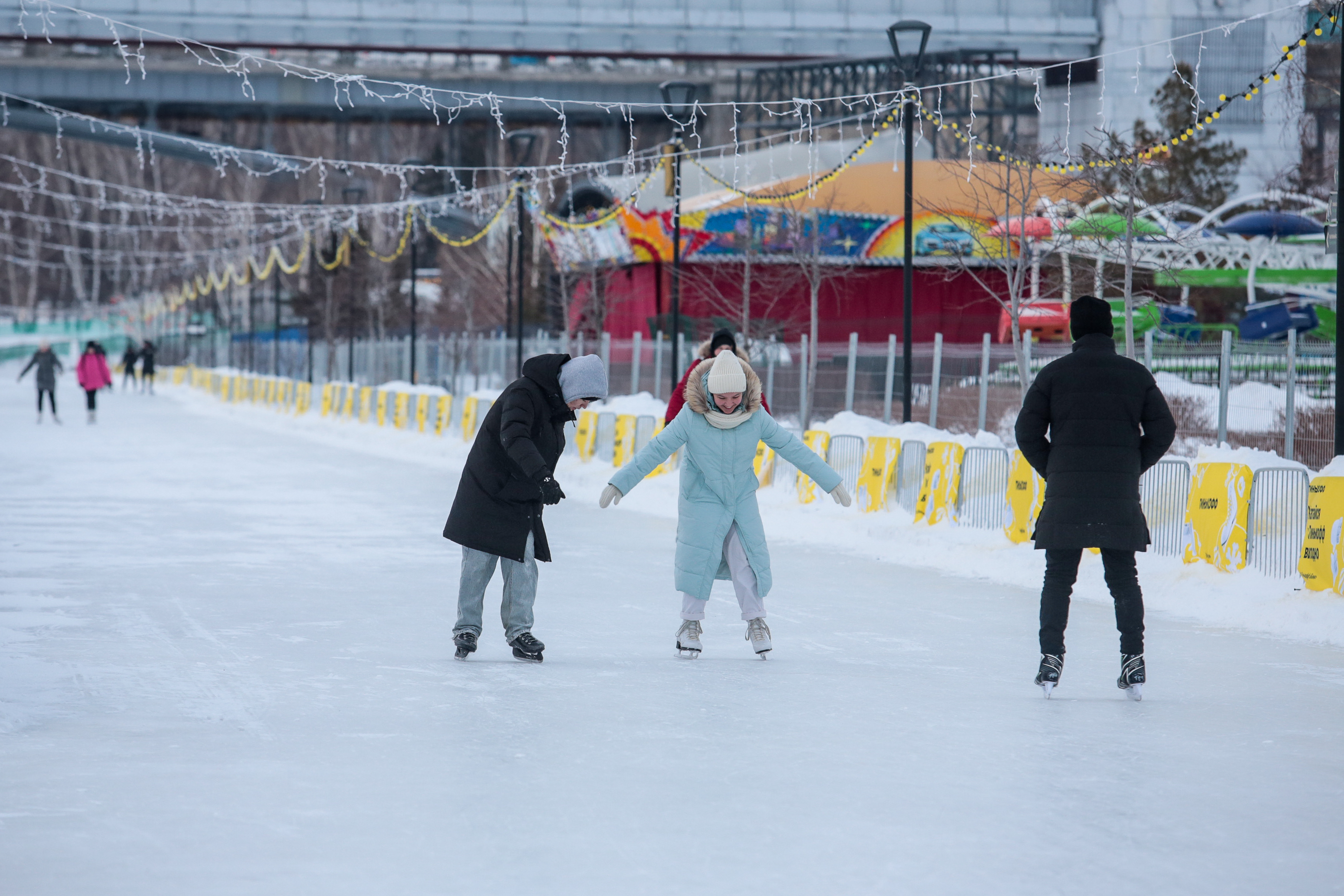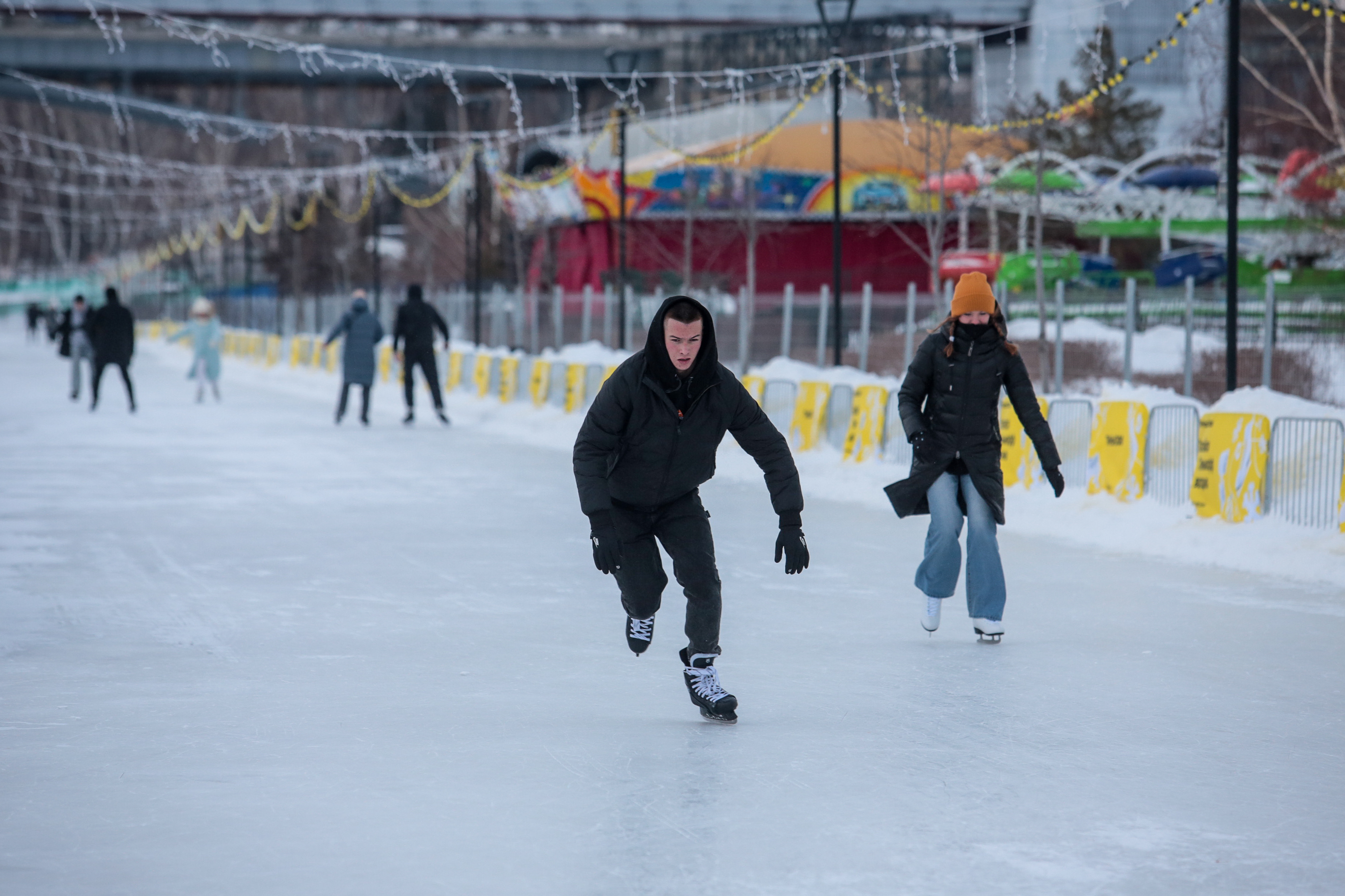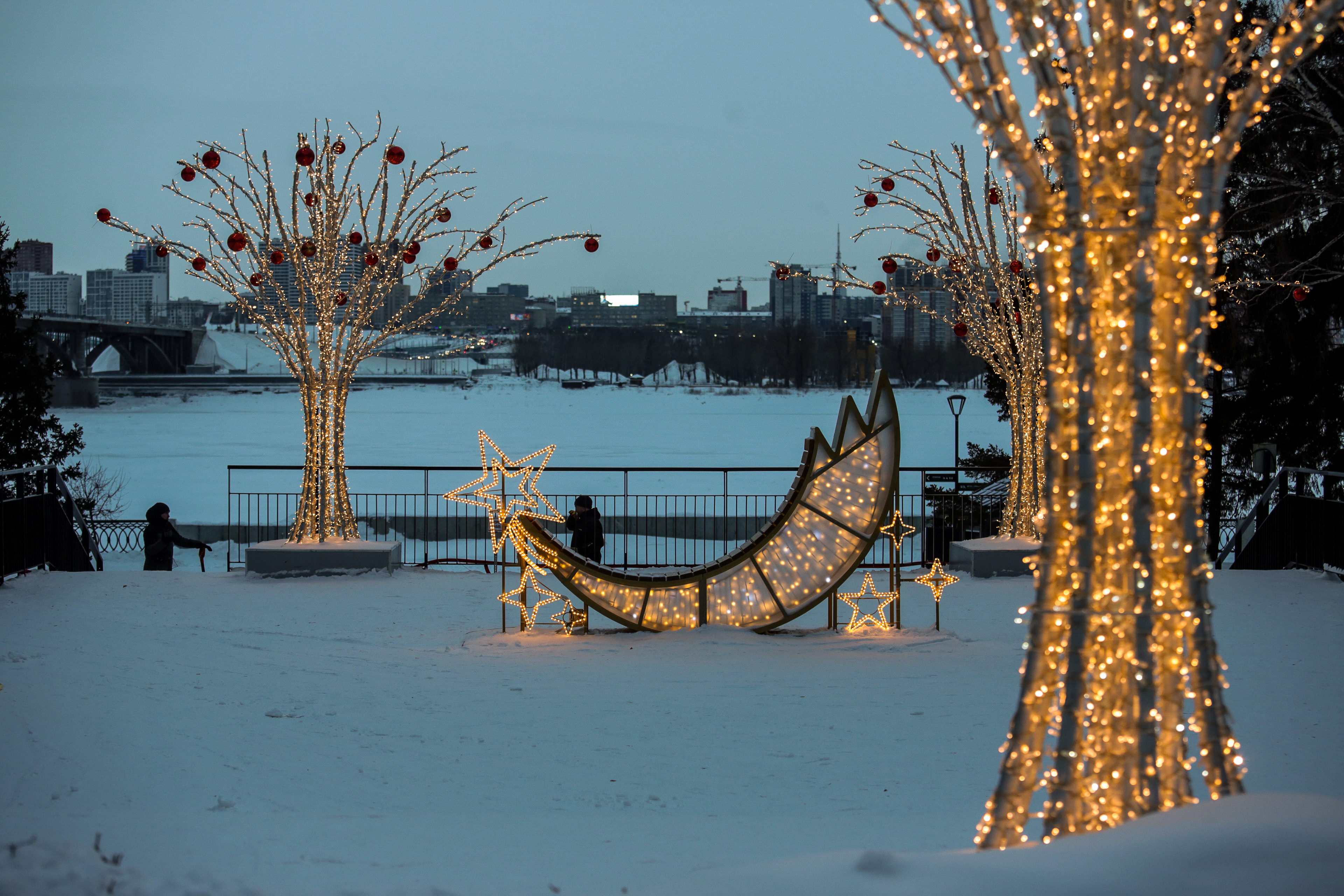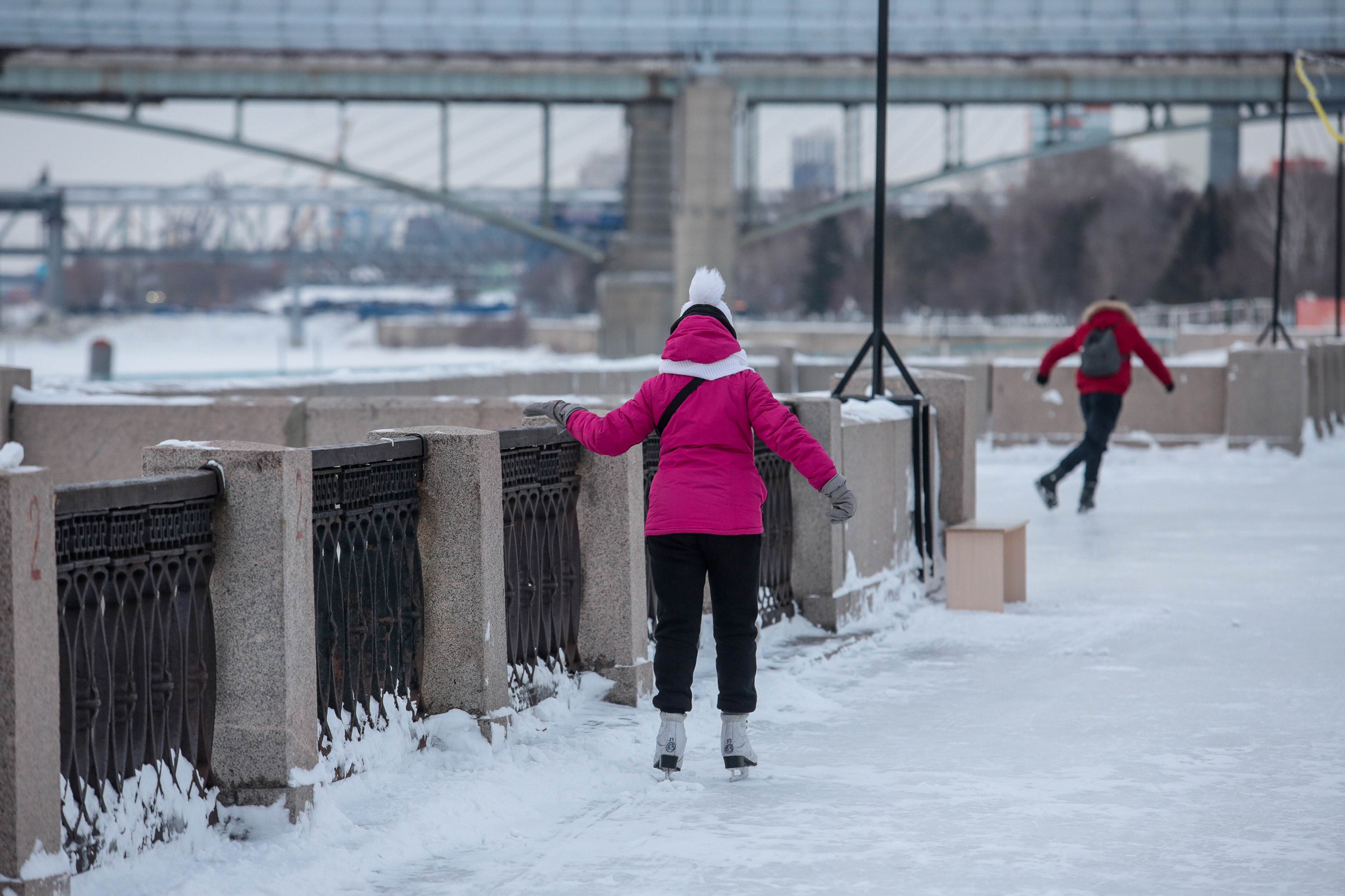 Этой зимой каток на набережной меньше, чем прошлой, когда он официально поставил мировой рекорд по длине (1300 метров). Сейчас из-за ремонта Октябрьского моста залить лёд вдоль всего нижнего променада не получилось. Но здесь всё те же потрясающие виды на реку Обь и левобережную часть города.