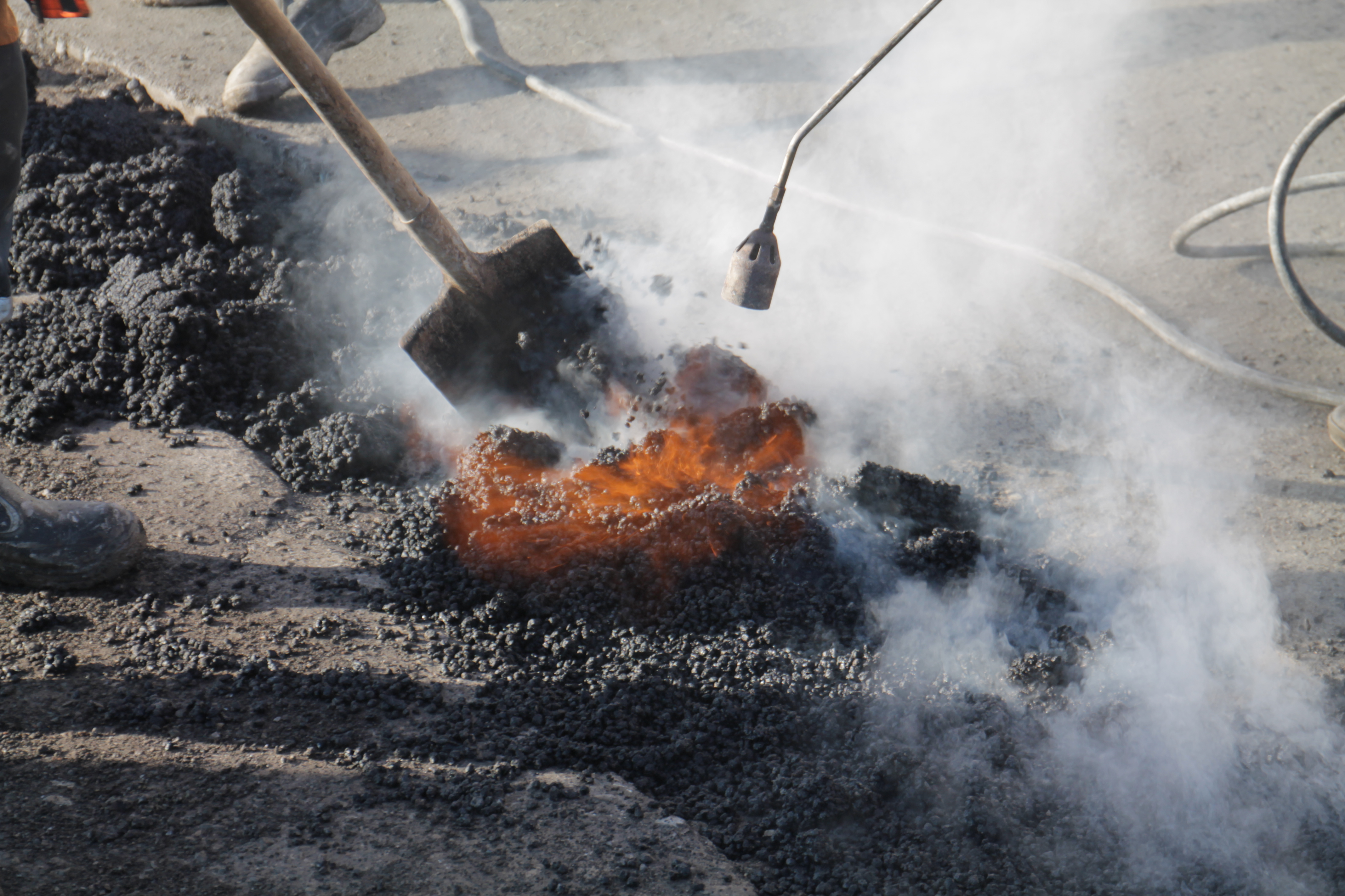При ямочном ремонте сначала нужно подготовить углубление: осушить его и обработать края. После этого яму заполняют холодным асфальтом. Обычно его используют зимой, когда температура варьируется от −30 до +5 градусов. Покрытие сразу же закрепляют и выравнивают катком.