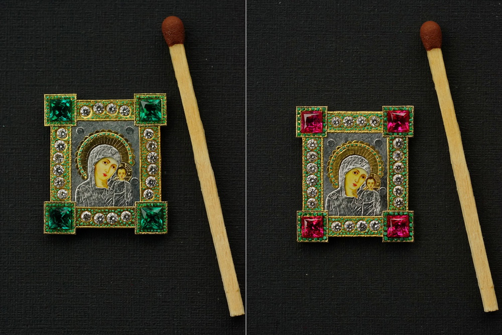 Две иконы уже заняты: одну (с сапфирами) Владимир Анискин подарит, вторую (на выбор) продаст заказчику, её примерная стоимость — около 600 тысяч рублей. Судьба ещё двух православных миниатюр пока не определена.