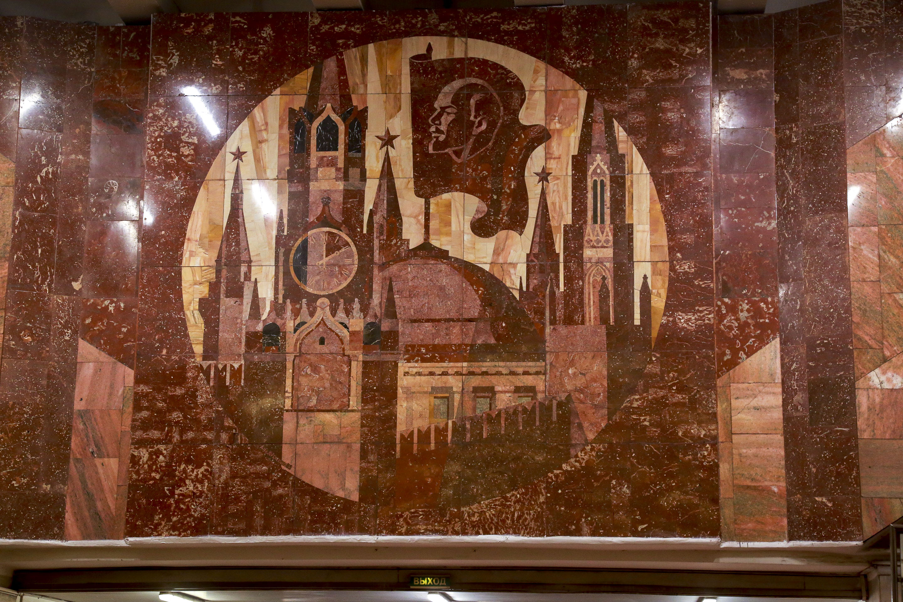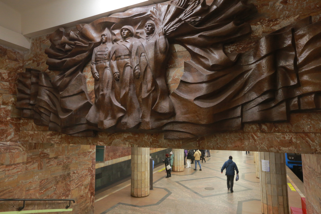 Над входами на платформу расположены два рельефных панно. Их выполнил с помощью выколотки из меди скульптор Владимир Грачёв. Эти работы имеют общее название — «Победный марш». На одной — группа из трёх красноармейцев, на второй — серп и молот в окружении лаврового венка и медных труб.