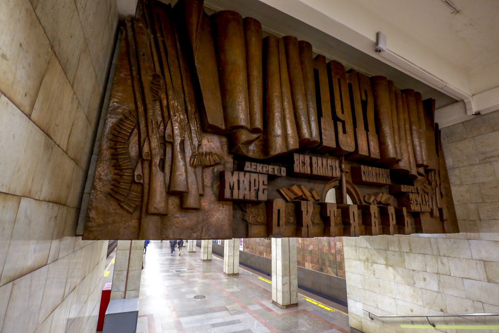 Украшением простанства служит масштабный барельеф, созданный известным художником-монументалистом Александром Чернобровцевым. В центре композиции он расположил цифры «1917» в стиле модерн, окружённые знамёнами. Чуть ниже размещены буквы текстов: «Вся власть Советам», «Декрет о мире», «Декрет о земле». Внизу — арка генерального штаба и Александровская колонна Дворцовой площади. В этом же стиле выполнено название станции на путевых стенах.