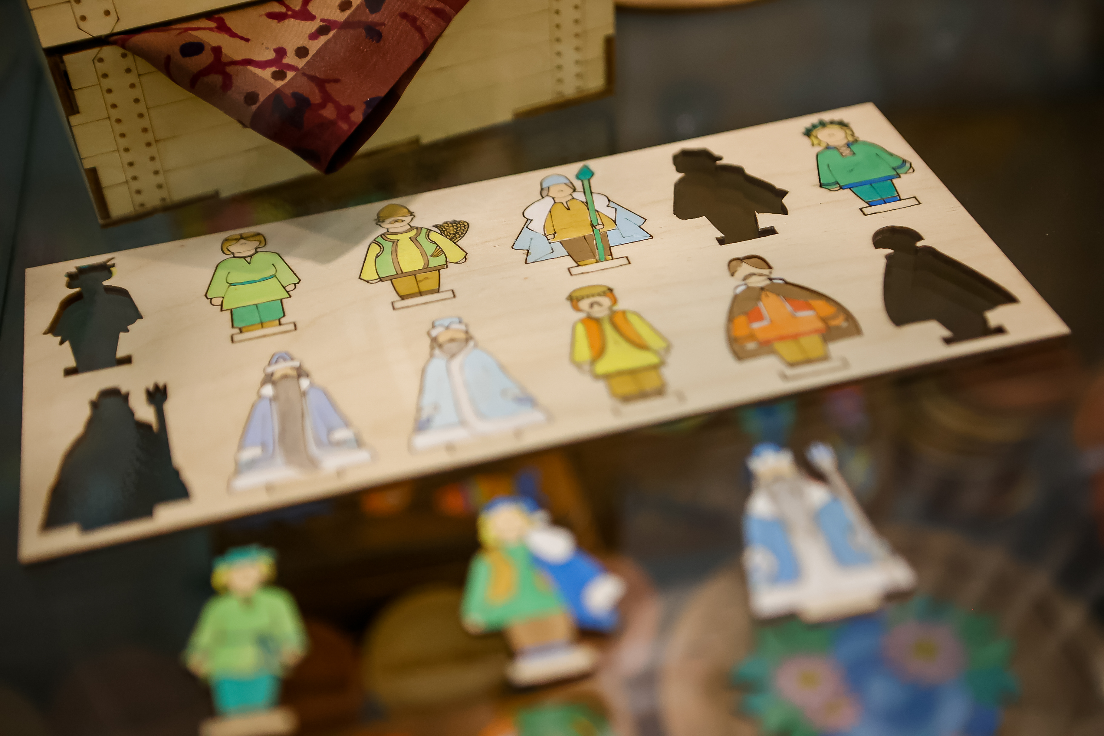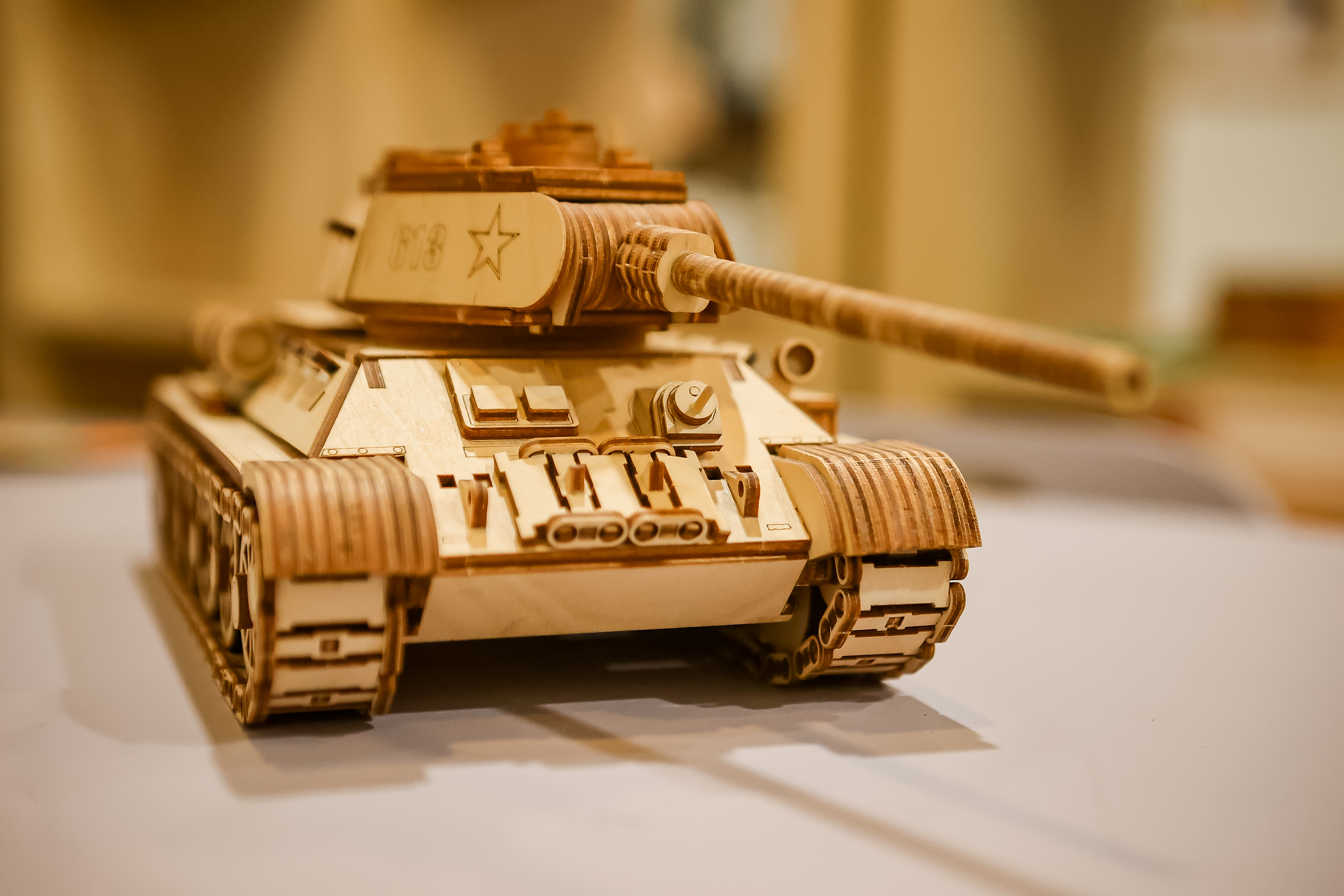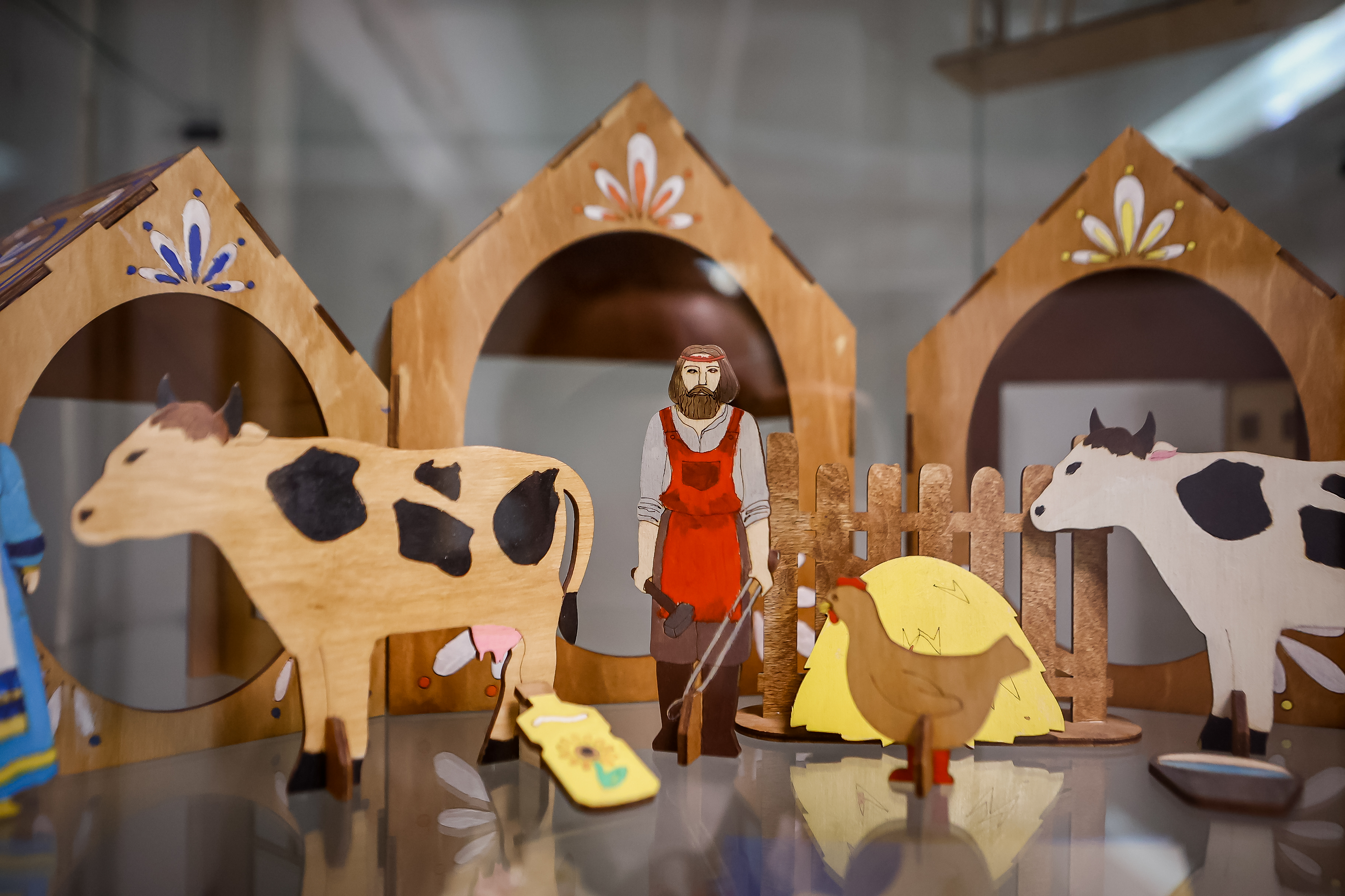 Все изделия выполнены из дерева — берёзовой фанеры. По словам Надежды Андреевой, в нём заложен огромный потенциал для работы: этому материалу можно придать любую форму, на нём можно рисовать, и, что немаловажно, он экологичен и безопасен. На стеллажах рядом с зайцами, былинными богатырями и машинками соседствуют и сложные конструкции, собранные из мелких деталей: танк Т-34, квадроцикл и даже миниатюрный Бугринский мост.