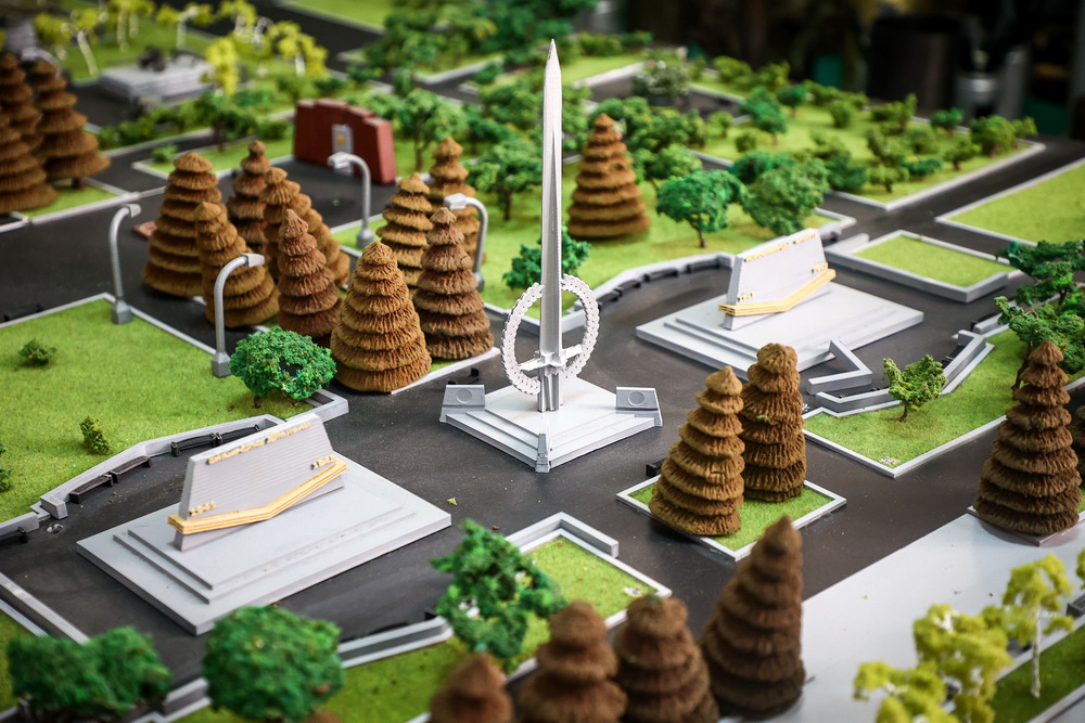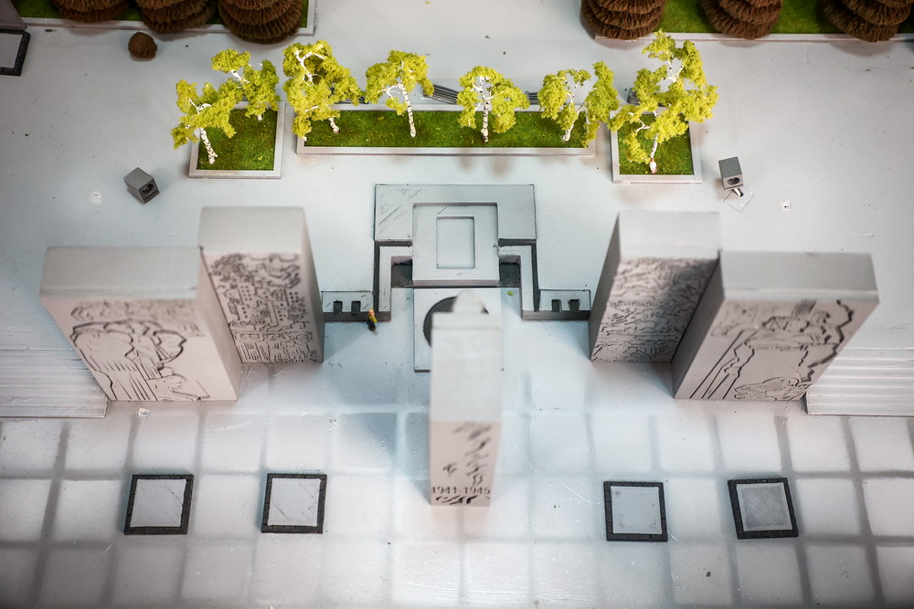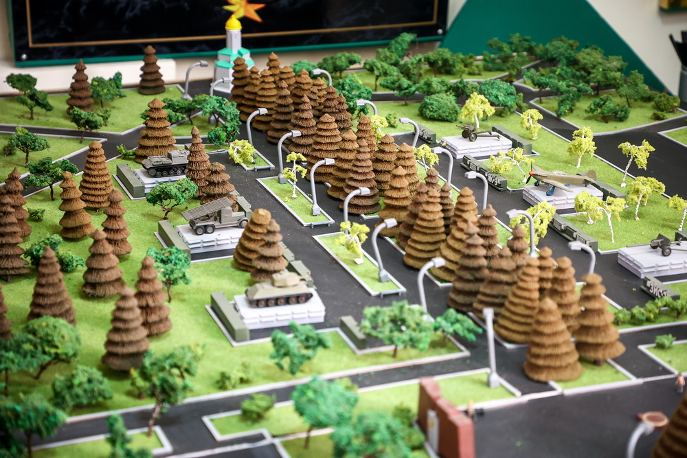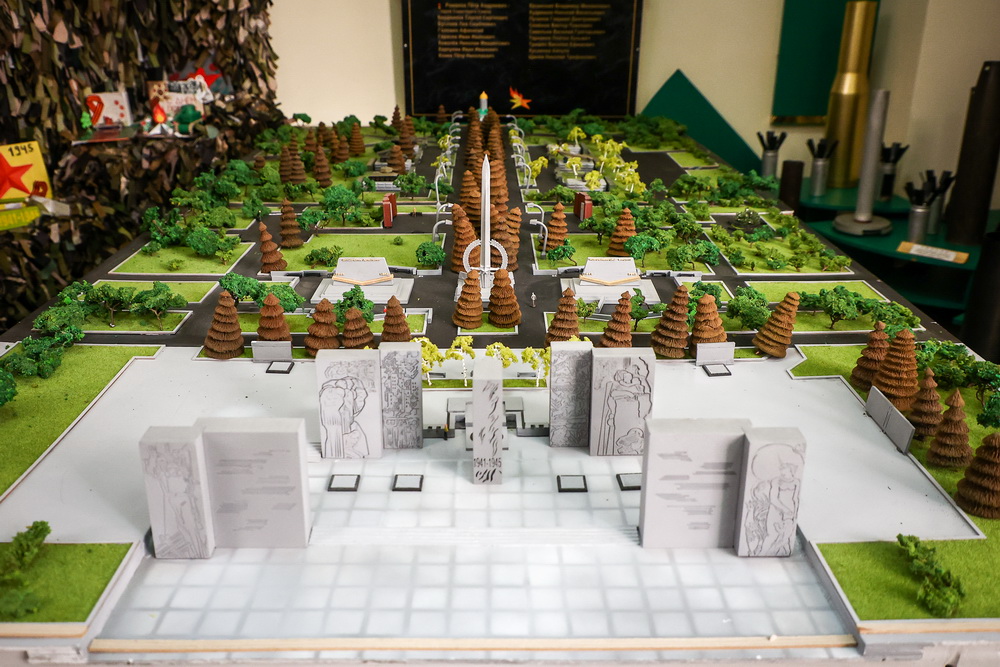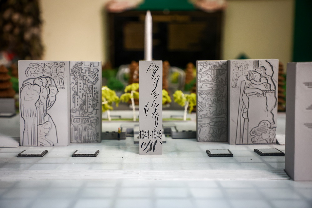 Ещё один макет, которым дорожит учреждение, представляет собой уменьшенную копию Монумента Славы. На ней можно увидеть масштаб мемориала со всеми памятниками и военной техникой. Сто величественных ёлок высажено вдоль двух главных аллей. По словам экскурсовода, фонари на миниатюре можно зажечь.