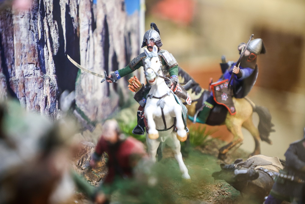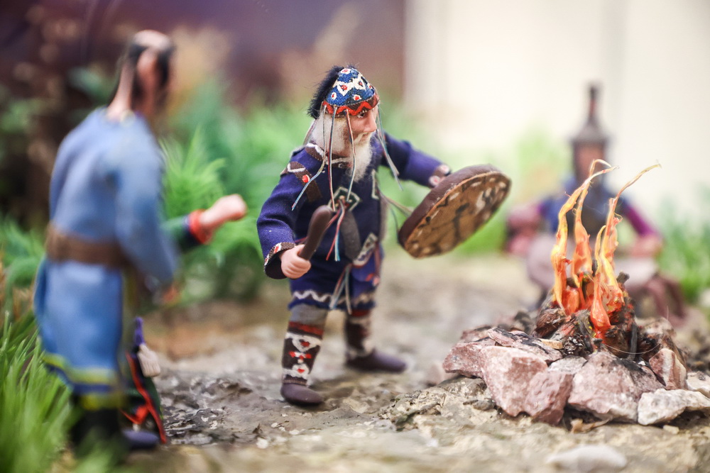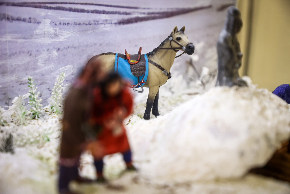 Вблизи стоит прозрачная витрина со сценками из жизни сибирских народов разных эпох, начиная с древности. Можно подробно разглядеть костюмы, доспехи, головные уборы, постройки, домашних животных, утварь.