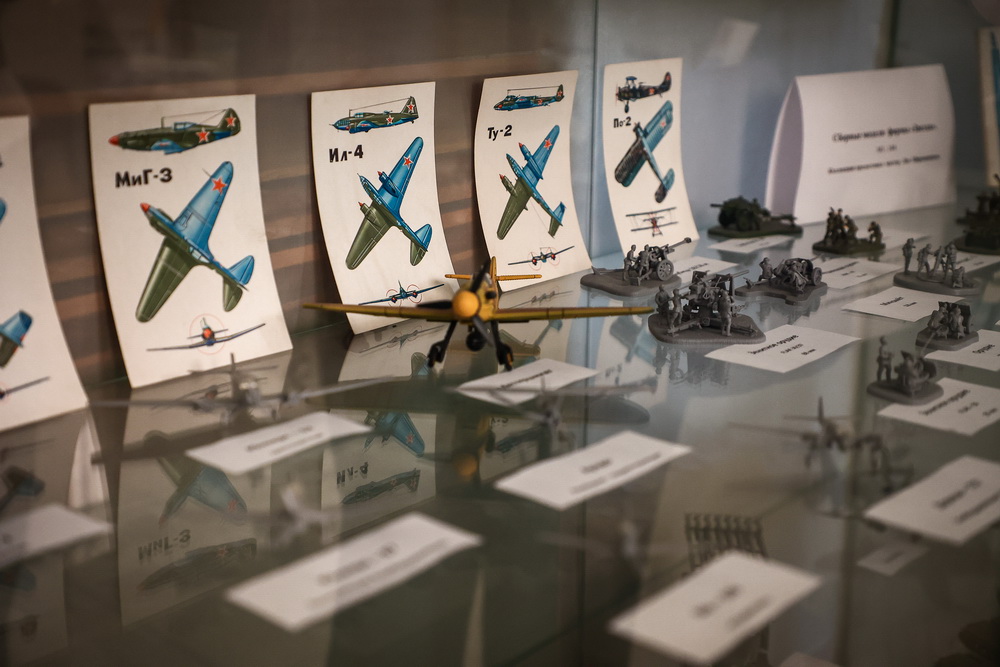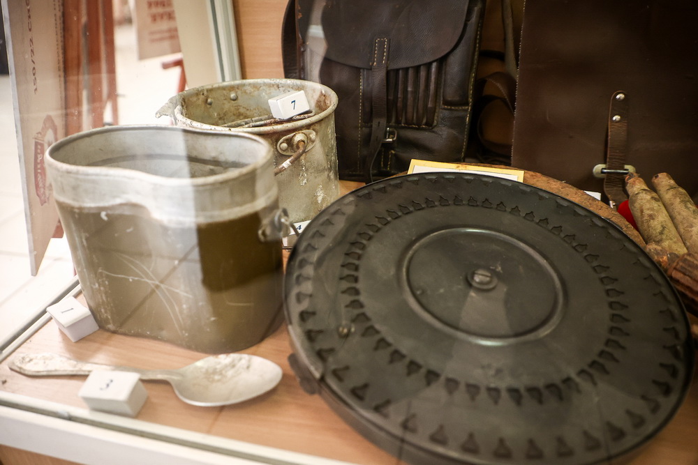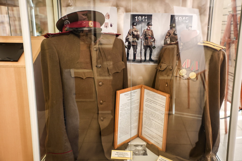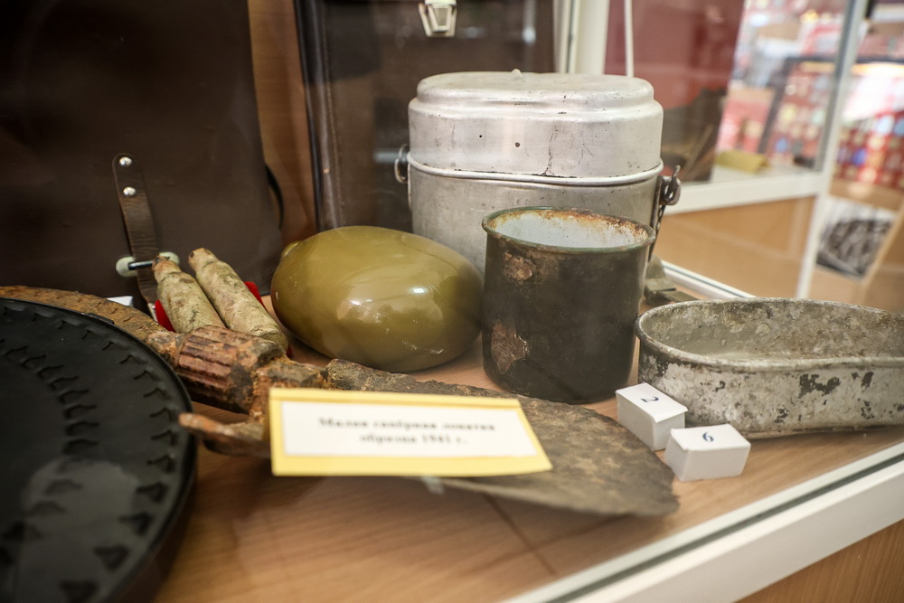 Ещё несколько витрин демонстрируют работы рукодельниц Ленинского района. Но большую часть выставки занимает экспозиция военной тематики, собранная стараниями новосибирцев. Она знакомит гостей с историей солдатской и офицерской формы, показывает предметы, которые нашли при раскопках в местах Великой Отечественной войны.