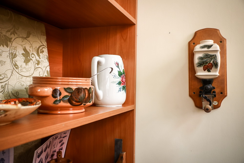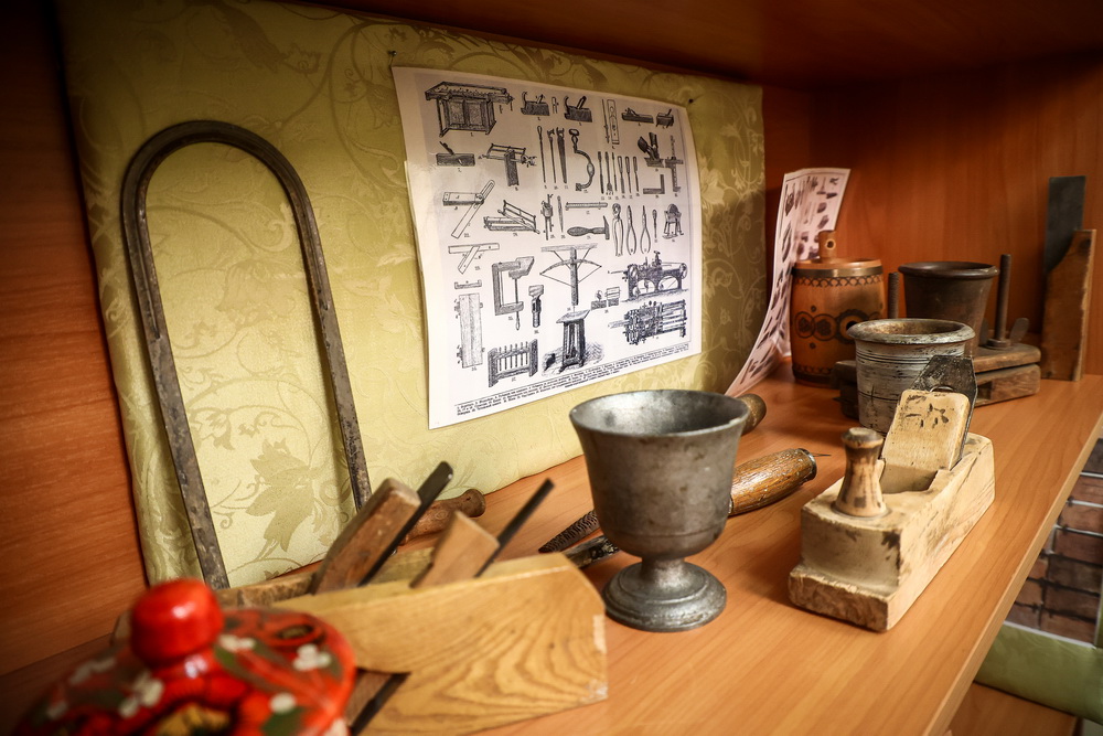 Вокруг макета находится множество старинных предметов, подаренных новосибирцами Центру истории. Здесь посуда, утюги, гвозди и инструменты. На стене висит занятная кофемолка советского периода.