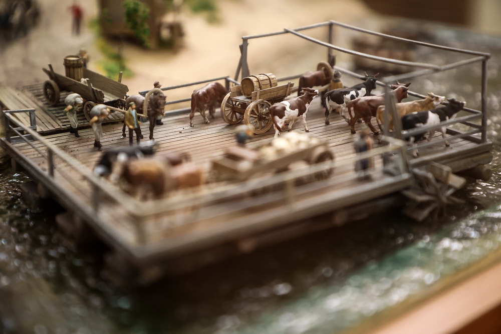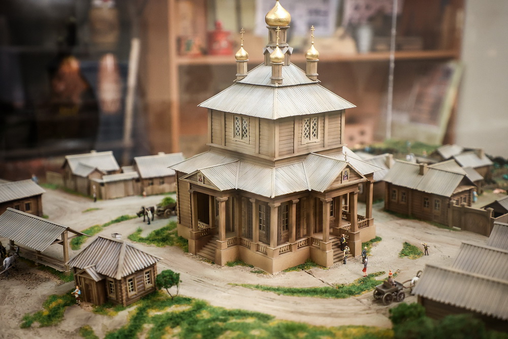 Миниатюру поселения, переросшего в мегаполис, создавали больше двух лет. В макете, выполненном в масштабе 1:87, учли все топографические и географические особенности территории. Мы видим две основные улицы села с их усадьбами, главную площадь с церковью, паромную переправу. В 1894 году в этом месте на левом берегу заложили первую опору железнодорожного моста через Обь.