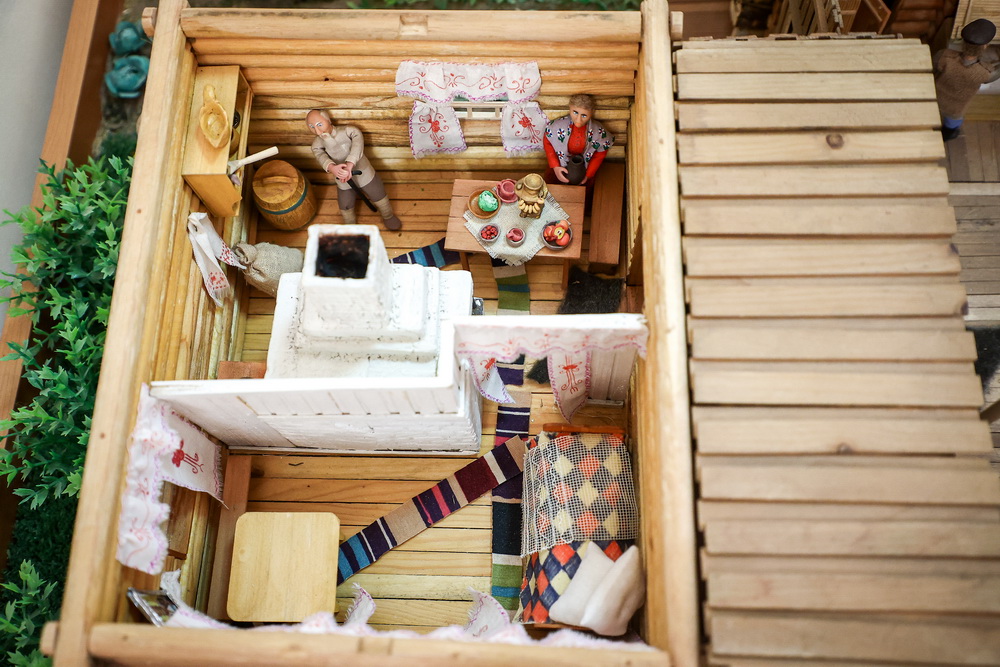 В крестьянском жилище есть печка, на столе стоят самовар, посуда, в том числе и с картошкой, а у разрезанного яблока даже семечки видны. Вокруг избы обустроен огород с грядками. Все мельчайшие детали проработала школьница Аня Чеснокова.