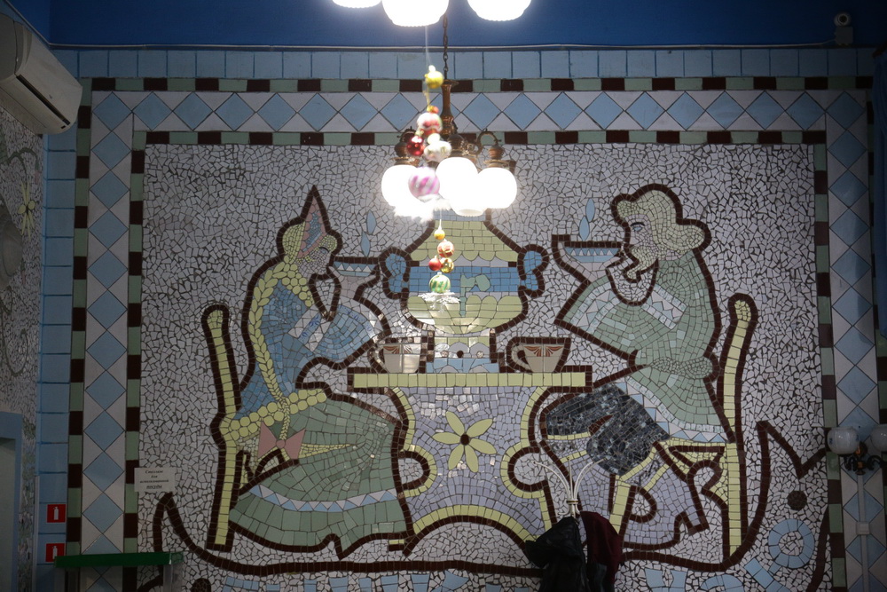 Мозаика, ради которой в пышечную приезжают издалека, сделана не из смальты — это кусочки битой керамической плитки. И любопытно, что ни один фрагмент не отвалился. Судя по сохранившимся документам, все мозаики в кафе, столовых и кулинариях Новосибирска делали специальные ремонтно-строительные бригады трестов. Тогдашние креативщики разрабатывали эскизы панно, сами декорировали интерьеры в заведениях.