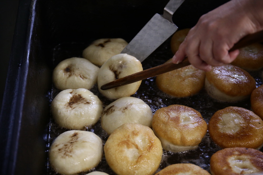 Пекари нашей пышечной никогда не работают с быстрыми дрожжами, только с прессованными. Если положено булке расстояться два часа — так её и расстаивают два часа. Пекарю надо видеть, какое тесто, смотреть, чтобы оно не перекисло. Бросили пышку в масло — надо следить, чтобы не пережарилась. Кстати, для жарки пышек используют специальную сковороду внушительных размеров.