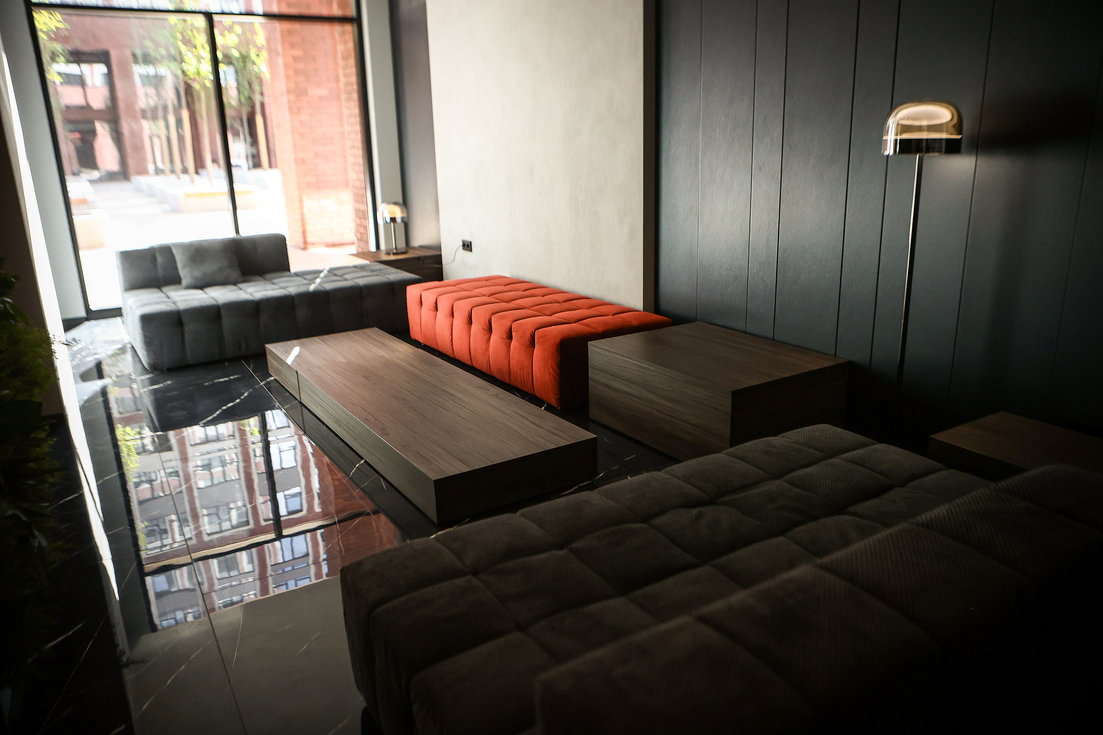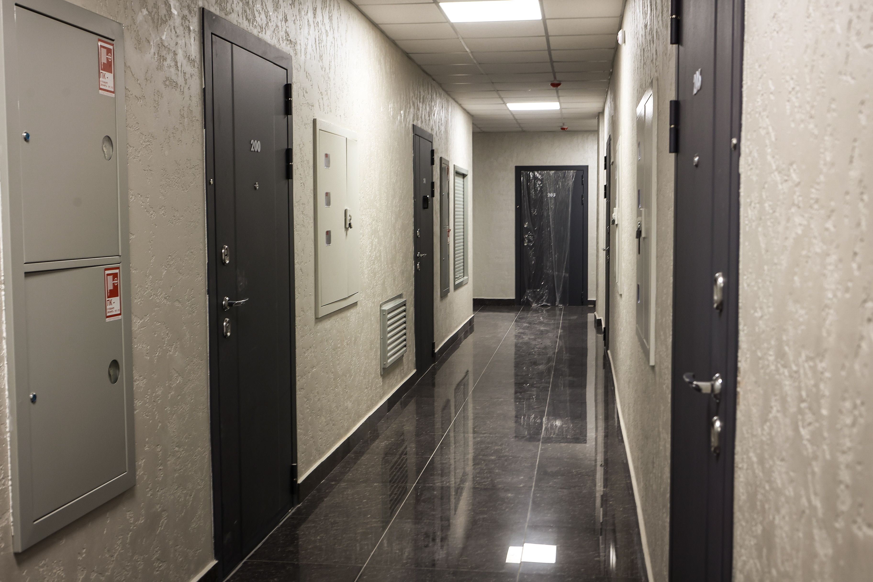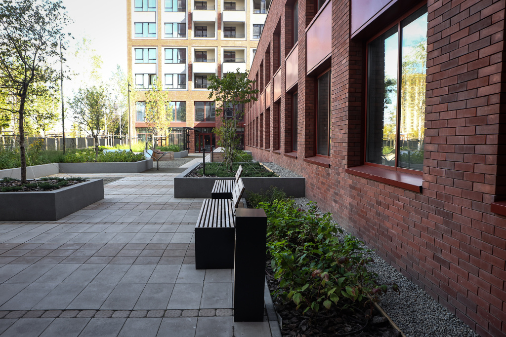 В холлах на первых этажах домов обустроили зоны ожидания с мягкой мебелью, журнальными столами и светильниками. Жилые помещения начинаются с третьего этажа. У квартир, расположенных на верхних этажах, предусмотрены террасы.